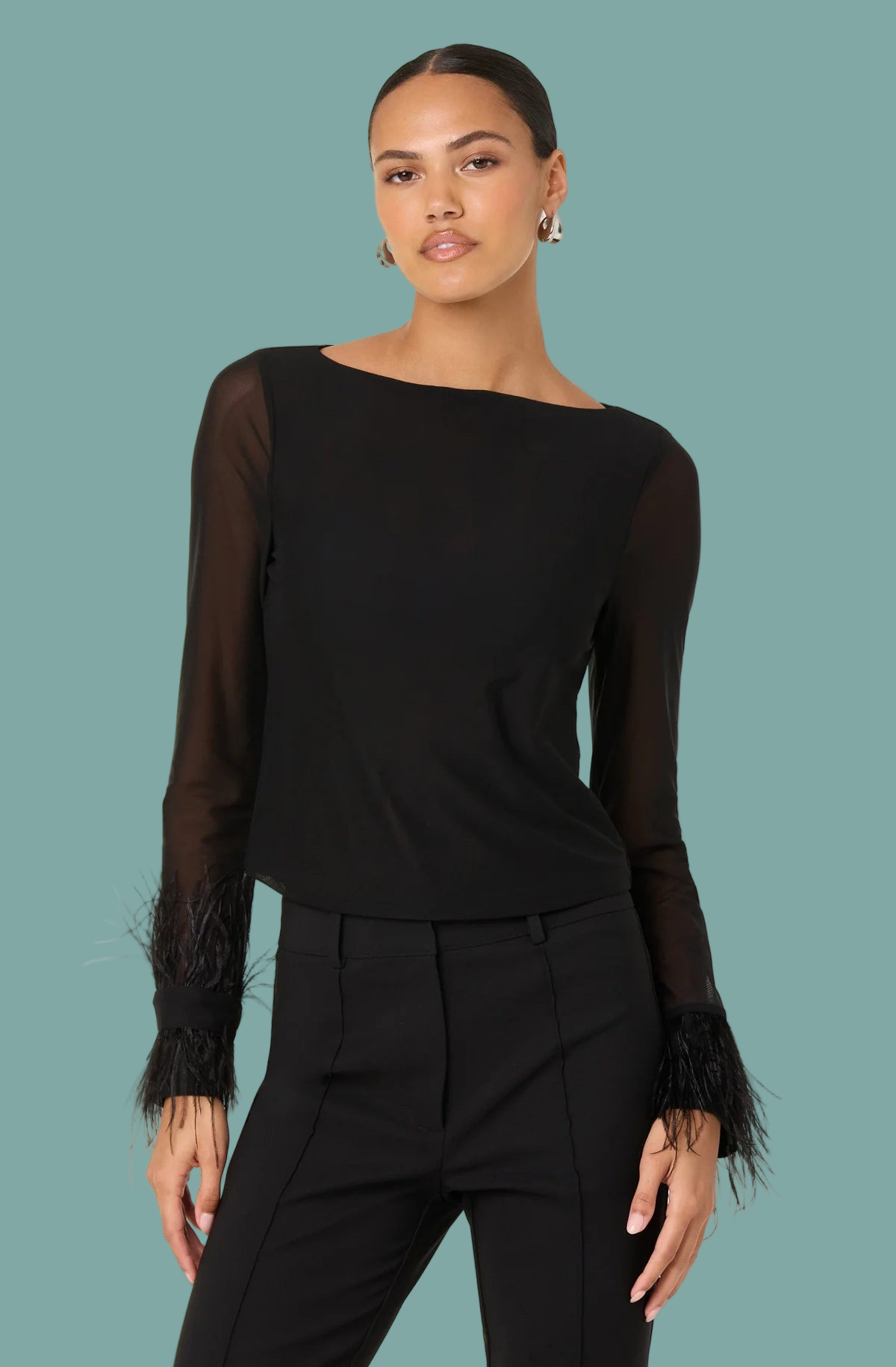 Playful yet chic, this feather trim top is your go-to for nights out and party plans.