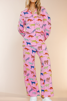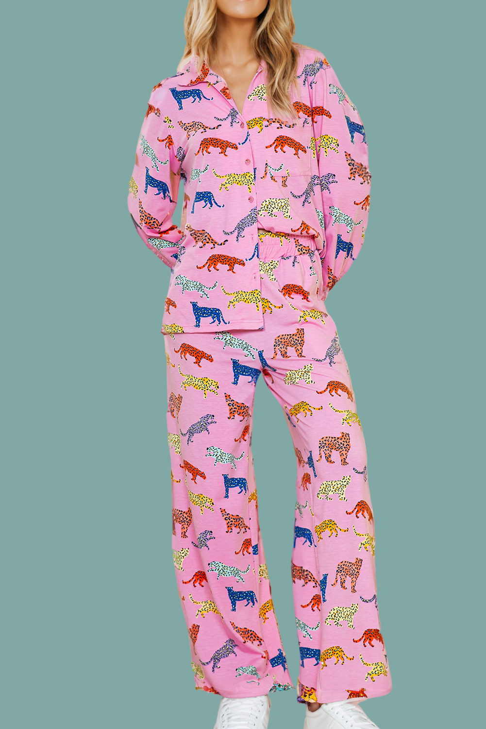 Snooze in style with our Jungle Jaguar Pajama Set. This pink two-piece features a button-down long sleeve top paired with matching pants, both adorned with a vibrant multicolored jaguar design that brings a playful jungle vibe to bedtime. Soft, comfortable fabric makes these pajamas perfect for cozy nights in. Whether you're lounging at home or getting ready for bed, this fun set keeps you looking cute and feeling great.