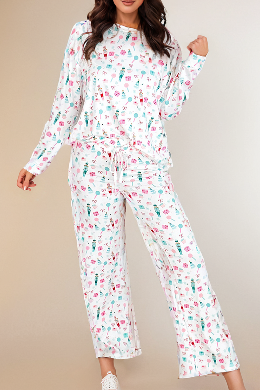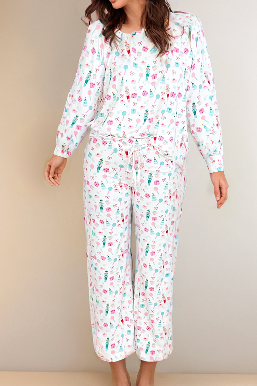 Get cozy this holiday season with our Jolly Nutcracker Pants Set, featuring a festive nutcracker and candy cane print perfect for spreading seasonal cheer. This matching set includes a comfortable long sleeve top and drawstring pants, ideal for lounging at home, holiday gatherings, or gift-giving. The relaxed fit and soft fabric make it your go-to choice for staying warm and stylish throughout the winter months. Embrace the holiday spirit in comfort and fun.
