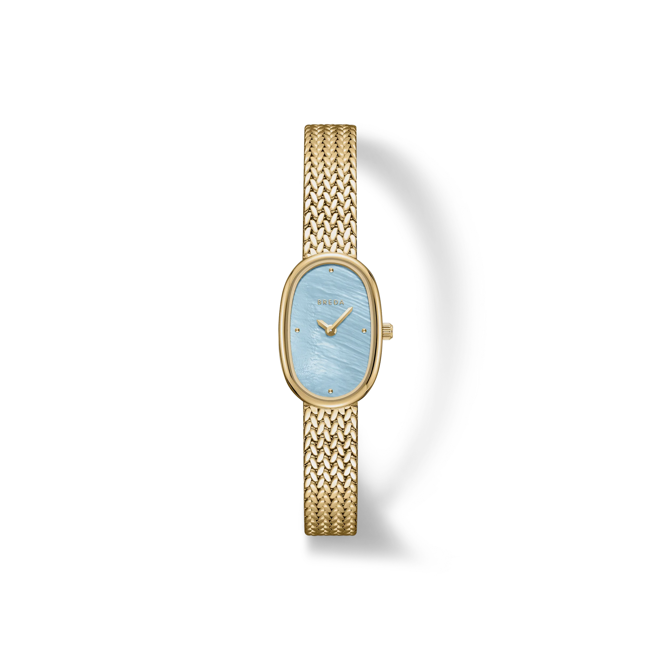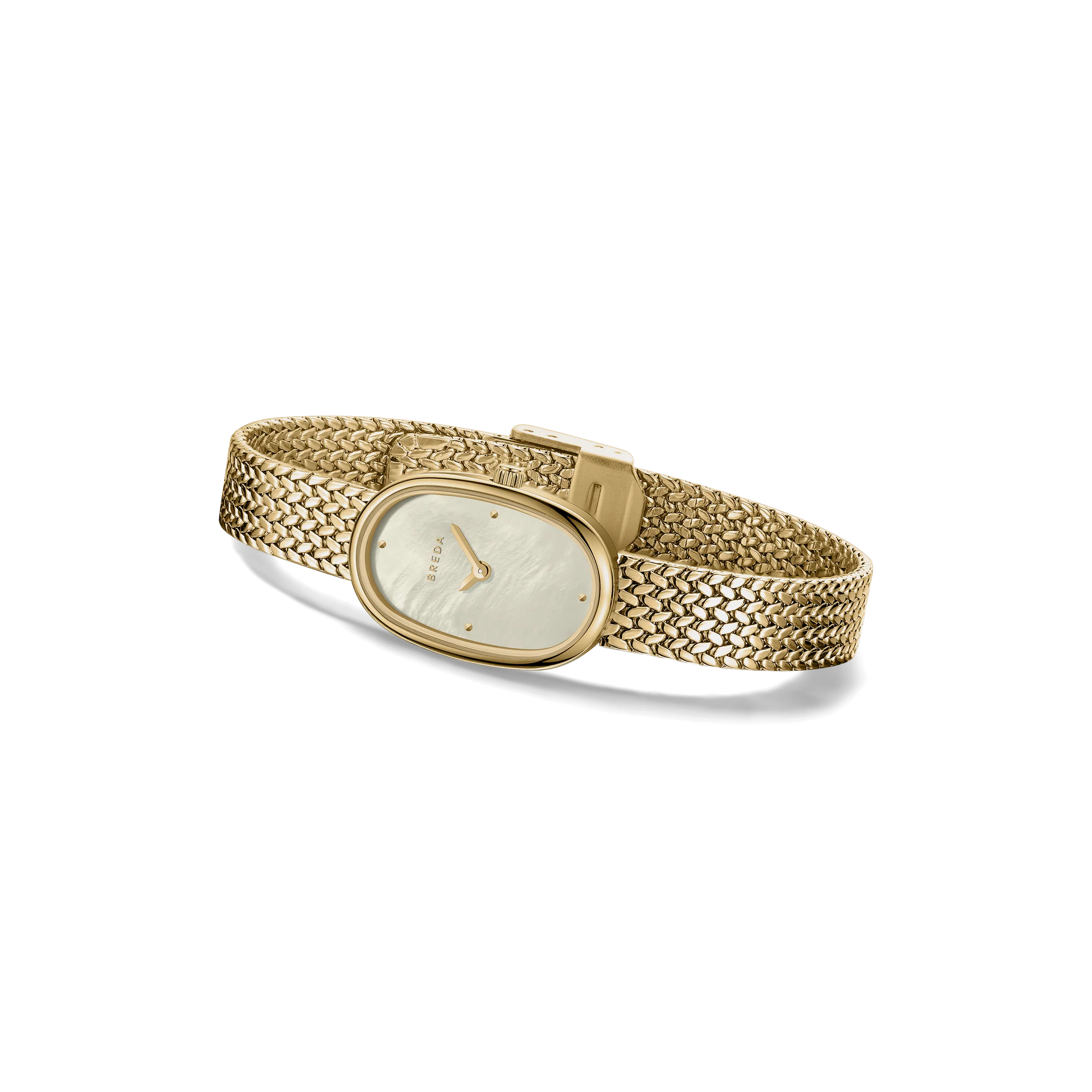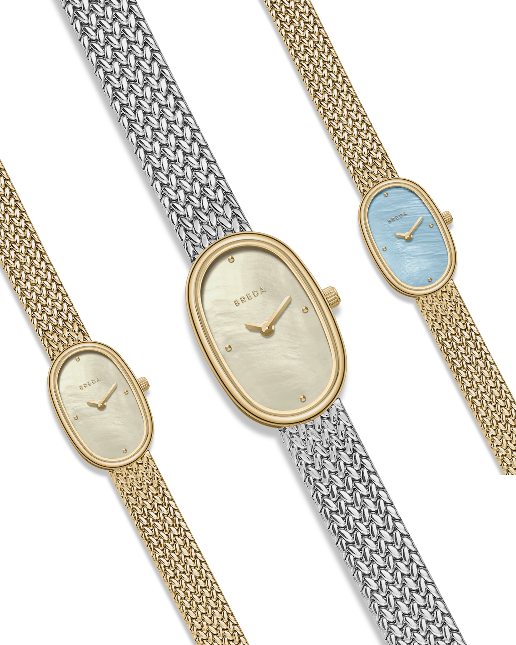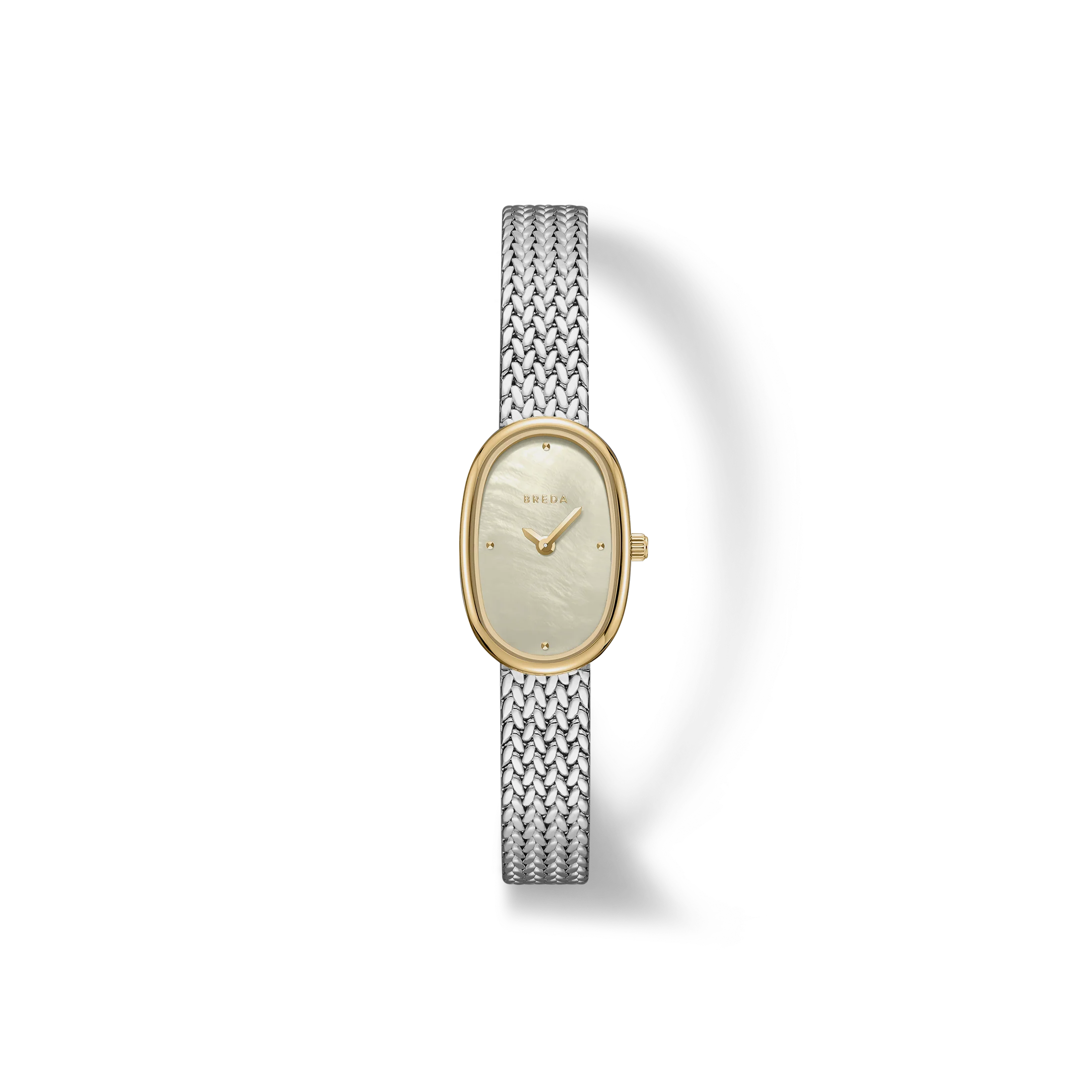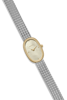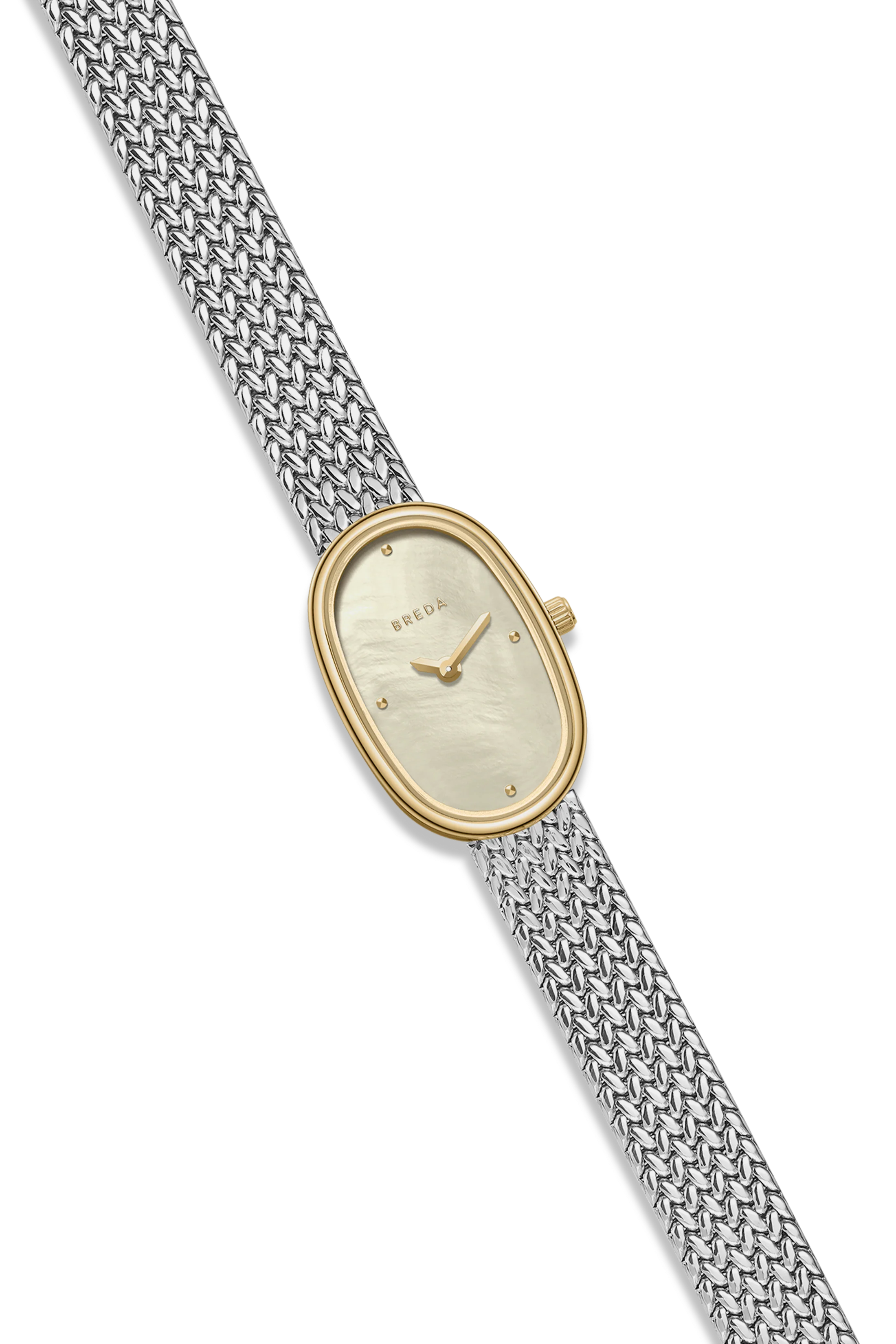 The Jane Tethered Mini Watch celebrates the bonds that tie us together. This petite timepiece features an 18mm oval case paired with a champagne mother of pearl dial that catches the light beautifully. The woven mesh bracelet includes a convenient quick release clasp for easy on-and-off wear. Each dial is uniquely textured—a natural characteristic of mother of pearl that makes your watch one-of-a-kind. Perfect for everyday wear, it's a subtle reminder of connection and shared moments.
