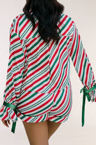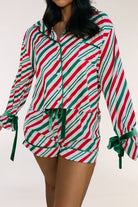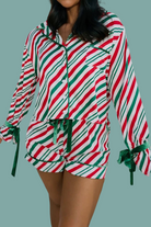 Get cozy in this festive pajama set featuring a green and red striped button-down long sleeve top paired with matching shorts. Both adorned with a charming green velvet ribbon detail that adds a touch of holiday elegance. Perfect for lounging through the season, this set combines comfort with playful style. Soft, breathable fabric keeps you comfortable all night long, whether you're winding down after a busy day or enjoying a lazy morning at home.