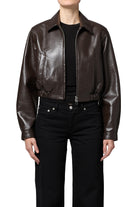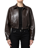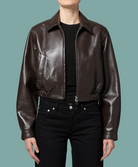 The Essie Recycled Cropped Jacket combines style and sustainability with its deep chocolate brown mid-weight stretch leather. Featuring a collared neck, two-way zip, and covered elastic waistband, it offers a comfortable, flattering fit. Practical welt front pockets and snap cuffs add casual functionality, while the smooth polyester lining ensures easy wear. Made from a blend of recycled leather and durable fabrics, this jacket is an eco-friendly choice with lasting appeal.
