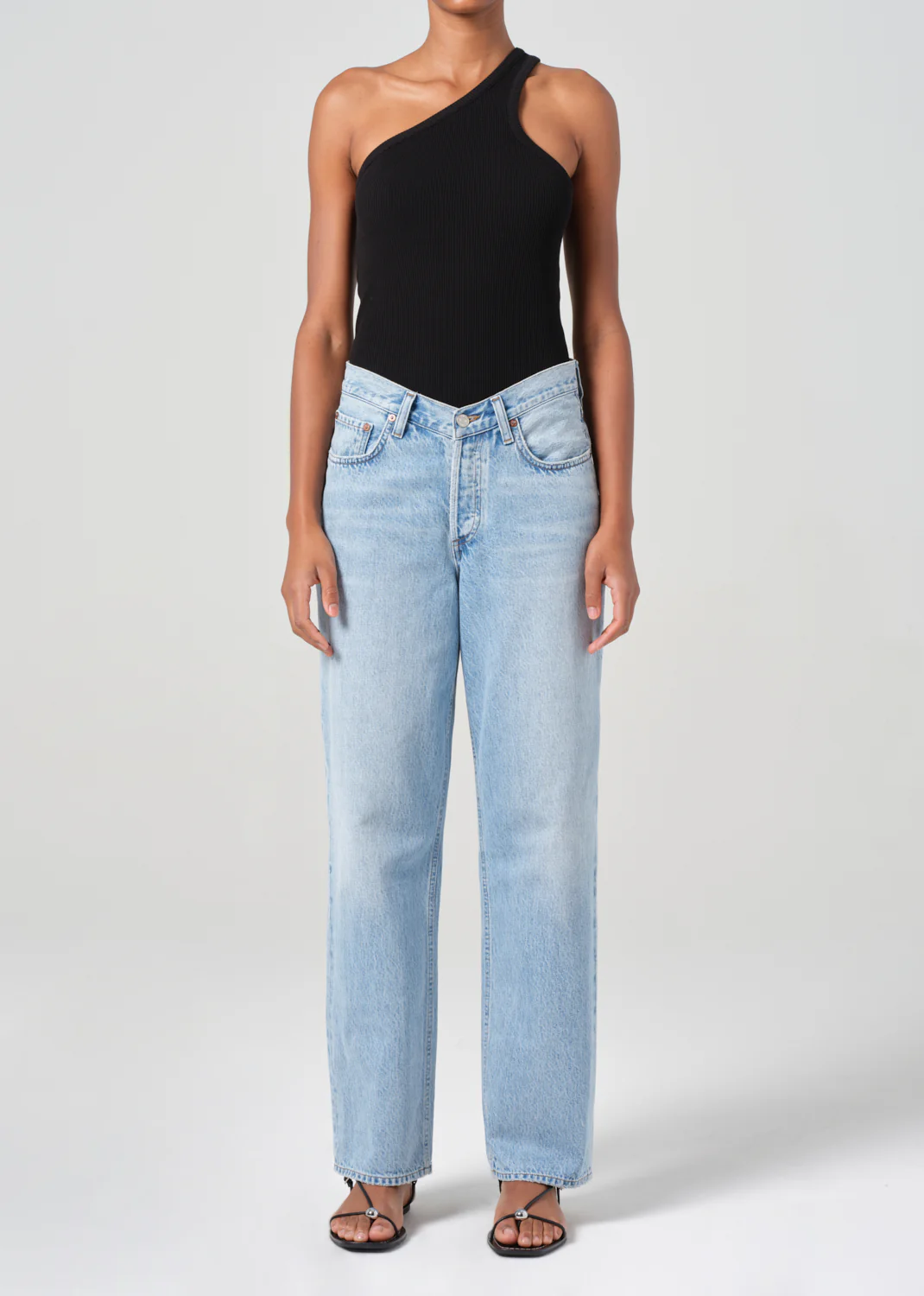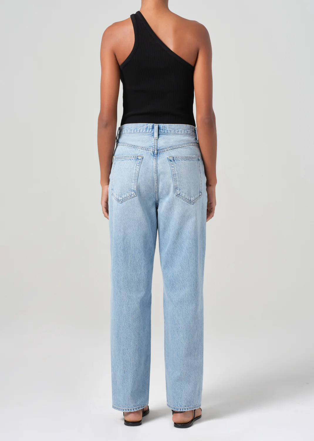 Introducing the newest jeans - the V-Waist Baggy Jeans! With its flattering v-front waistband and relaxed, straight leg silhouette, this style is both effortless and chic. Made from regenerative cotton, this light marbled indigo pair offers subtle fading and finished hems, adding a touch of effortless cool to your wardrobe.