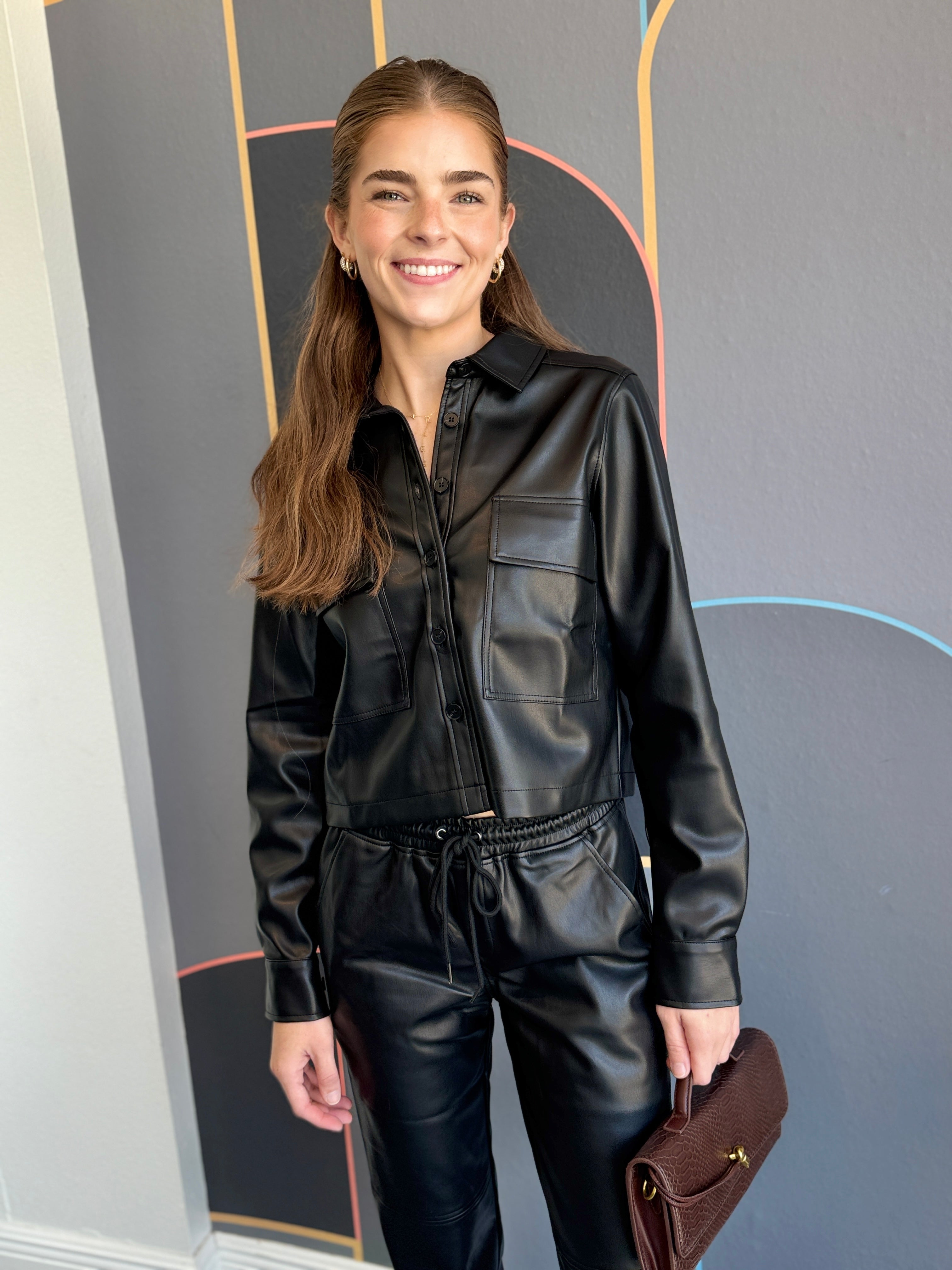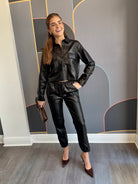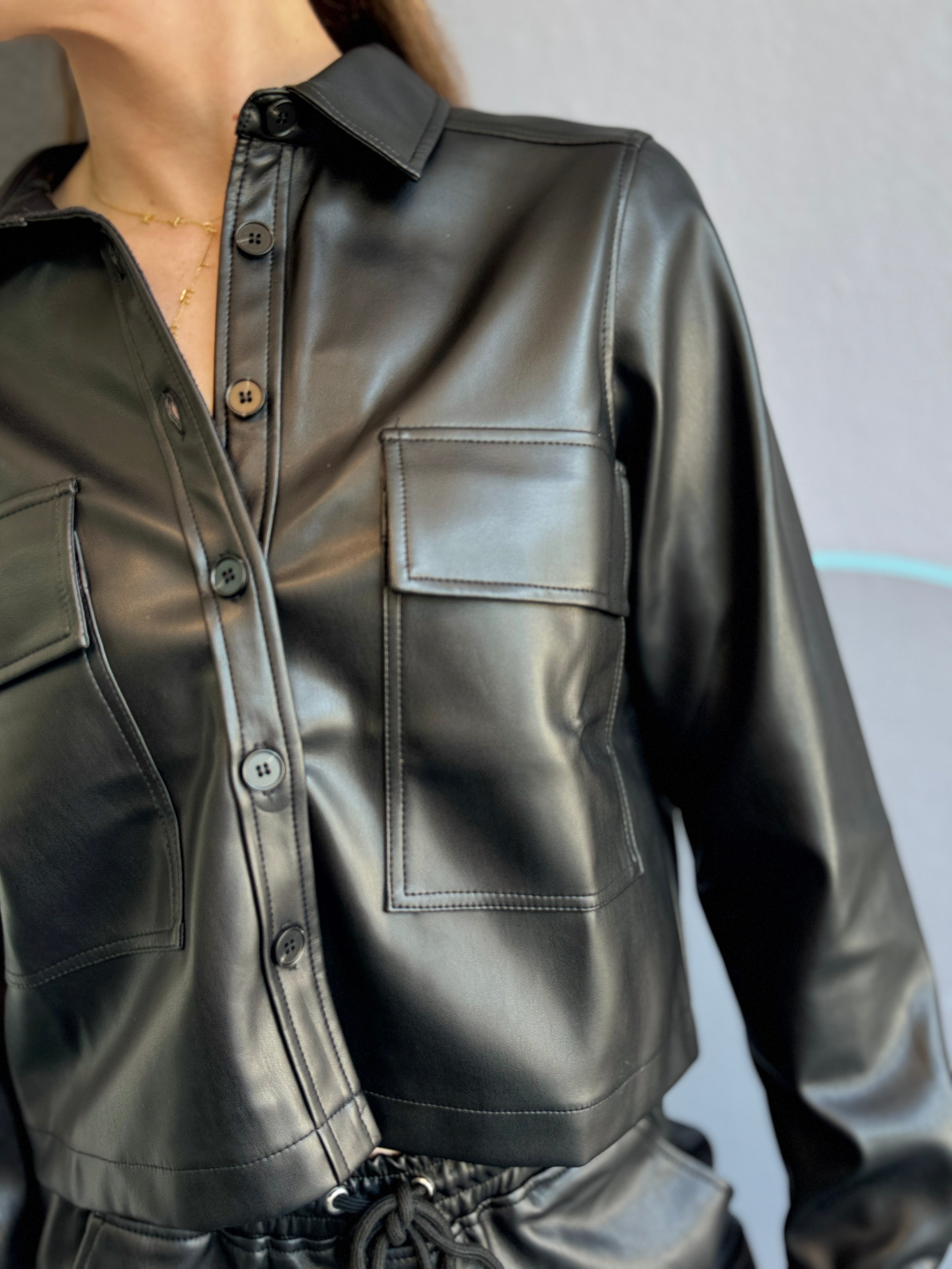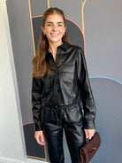 This cropped patch pocket leather shacket in black combines style and practicality with two front pockets for added convenience. Perfect for layering, it pairs effortlessly with denim, a satin slip skirt, or matching drawcord leather joggers for a relaxed, casual look.