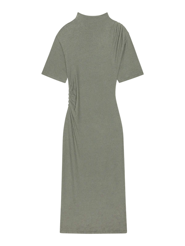 The Rebecca Mock Neck Dress, crafted from soft sweater-like Hacci Rib fabric, offers a flattering midi fit that hugs your curves. Its versatile design easily transitions from a polished look with heels to a laid-back vibe paired with a denim jacket. Available in a stylish Castor Grey, it’s perfect for both casual outings and dressier occasions.