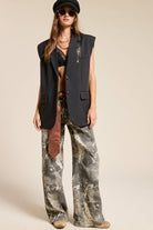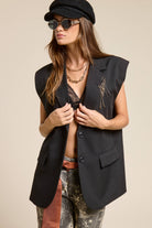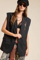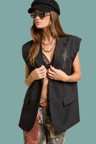 Take your layering to the next level with this oversized blazer vest. Featuring structured shoulder pads and a crisp tailored design, it offers a deep V neckline, notch lapels, front flap pockets, a chest welt pocket, and button closure. The roomy fit gives it a contemporary vibe, perfect for effortlessly moving from simple daytime outfits to polished evening styles.