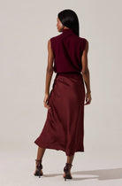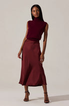 The Windey Satin Midi Skirt offers a stylish A-line silhouette that transitions seamlessly from office settings to casual outings. Crafted from smooth satin polyester, it features a concealed side zipper and hook & eye closure for a clean finish. Easy to dress up or down, this skirt combines comfort with effortless style. Dry clean only to maintain its elegant sheen.