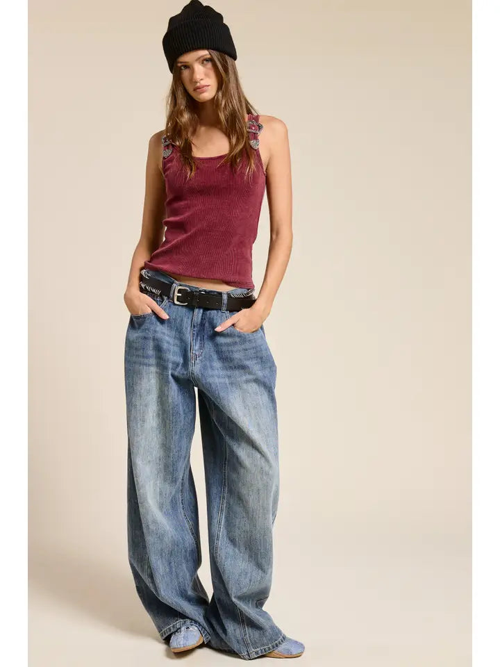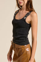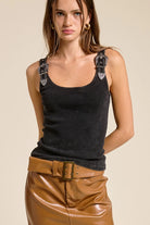 This ribbed tank top features a garment-dye wash and a scooped neckline, highlighted by Western silver belt trim on the shoulder straps. It has a regular-length fit, and each item is uniquely different because of the wash effect.