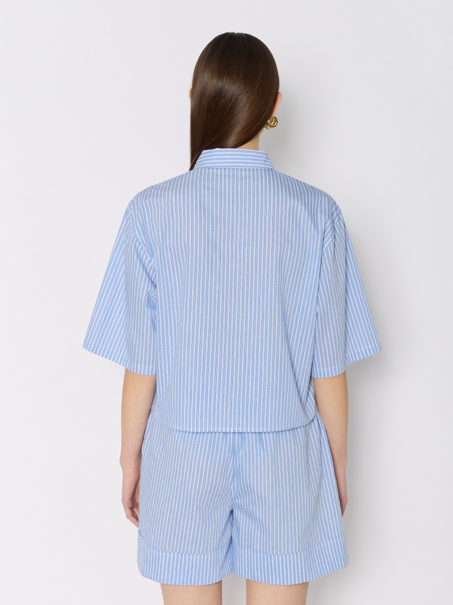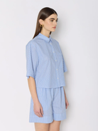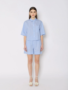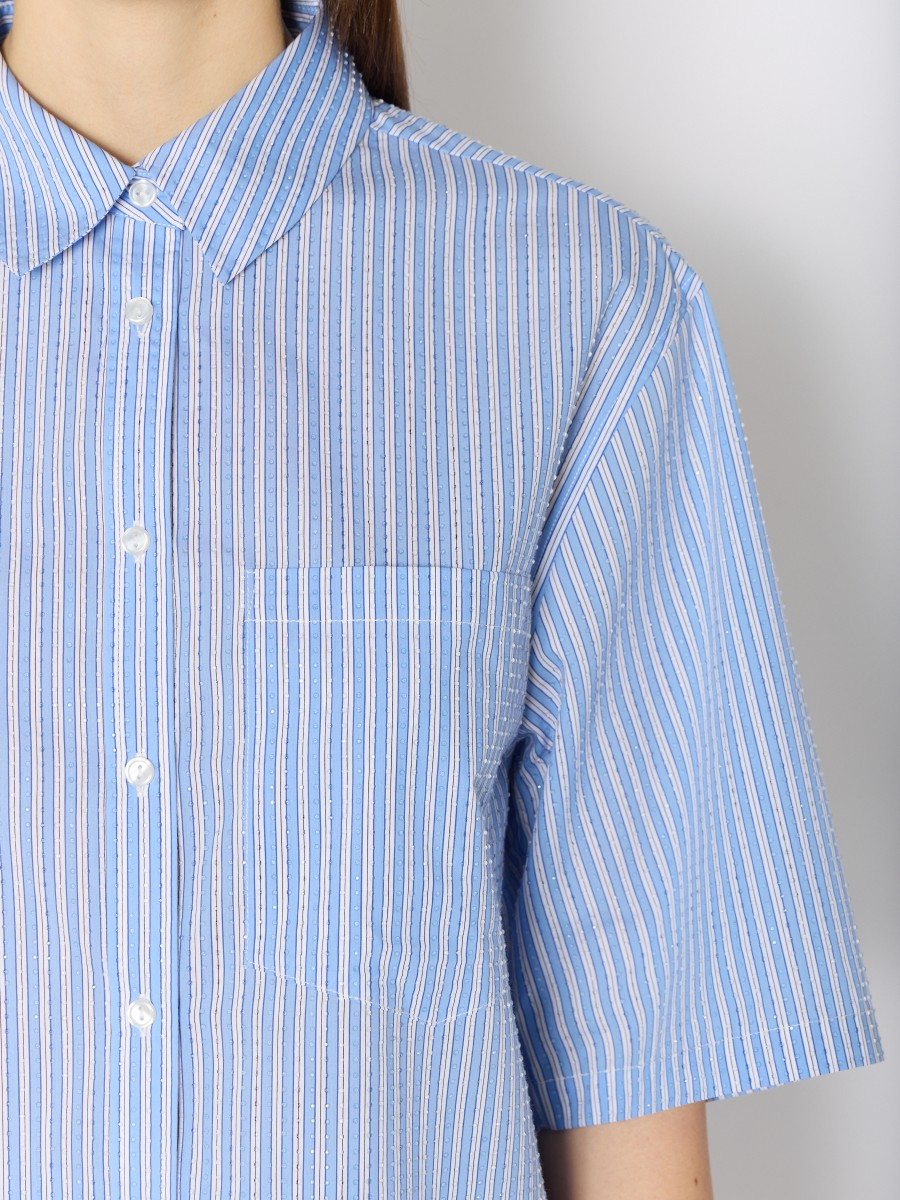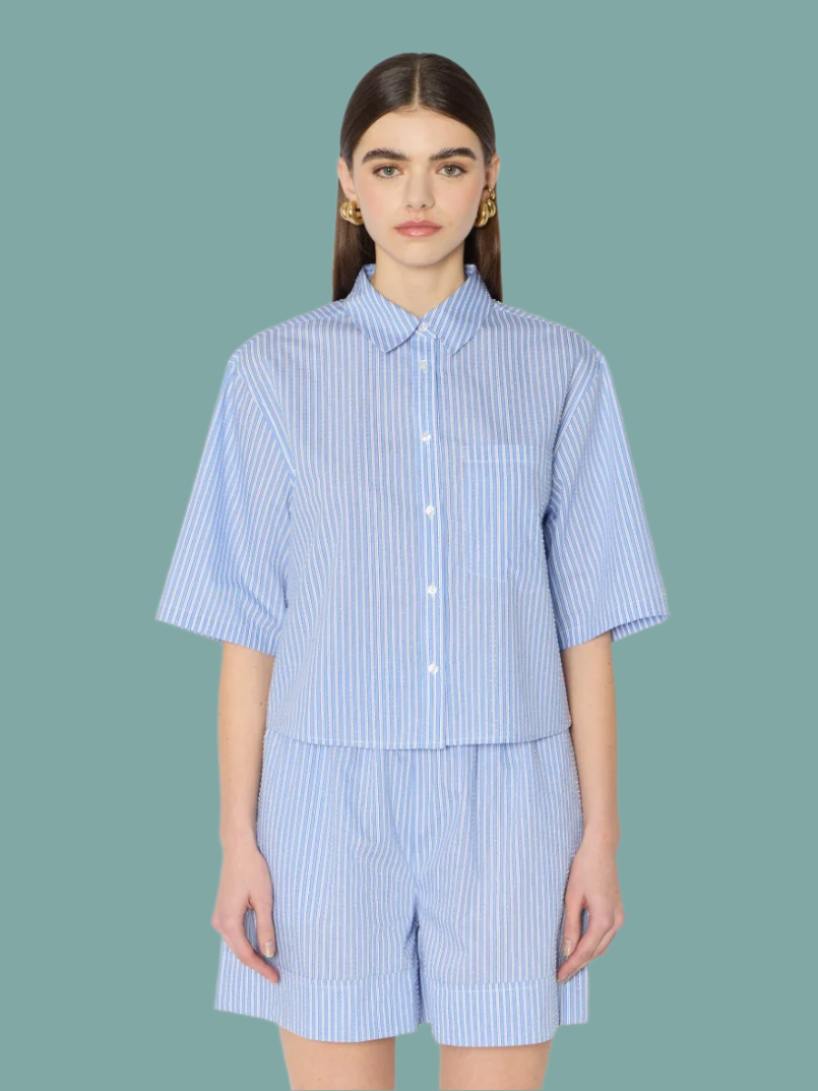The CIRILLA shirt is a chic and modern summer piece, ideal for adding a touch of shine to your outfit. Made in an elegant blue with white stripes, it has a trendy and refined design. clear rhinestones subtly adorn the shirt, catching the light and providing a discreet sparkle for a cool look. With its short sleeves and short cut, the CIRILLA shirt pairs perfectly with the matching PSELIN shorts, creating a coordinated set that exudes freshness and elegance. The shorts, matching the stripes and details of the shirt, complete the look with style. This set is perfect for a casual day, ensuring a harmonious and trendy style.