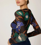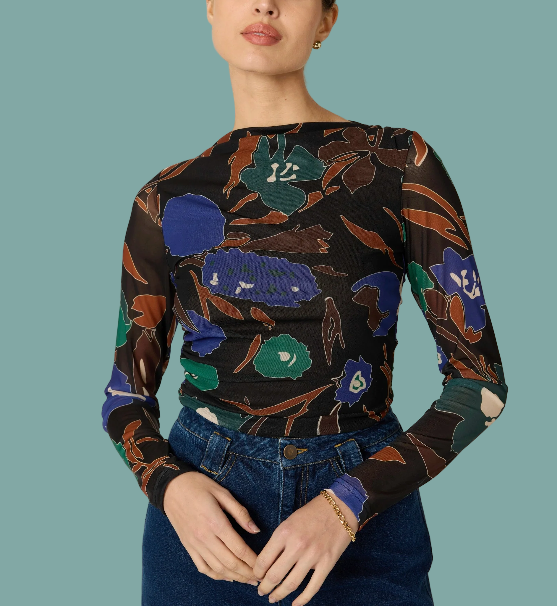 Ethically handmade in India from 88% nylon and 12% elastane, our best-selling Remy Top returns this fall in a dark floral Mariposa print. With its elegant high neckline and delicate shirring at the shoulders and waist, this flattering silhouette is a timeless piece designed to celebrate every body.
