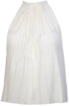 Effortless elegance meets comfort in this pleated halter tank top. Crafted in crisp white, the flowing silhouette features delicate pleats that create movement and dimension. The halter neckline offers a flattering, adjustable fit perfect for warm weather styling. Layer it over basics or wear solo for a breezy, laid-back look that transitions seamlessly from day to night.