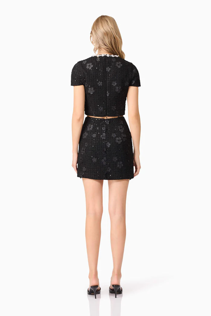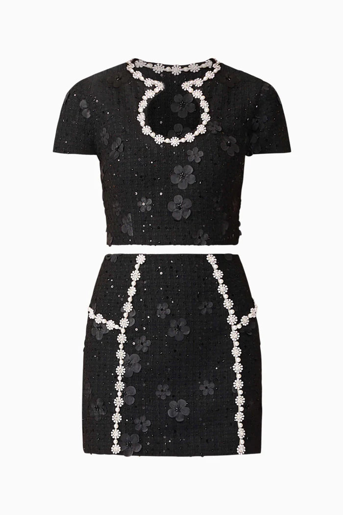The matching skirt completes the look with coordinating texture and tailored fit, offering versatility to wear together or as separates. Whether styled with heels for a polished evening outfit or dressed down with flats for a smart casual look, the Ellouise Embellished Tweed Set in Black is your go-to for effortless style and sophistication.