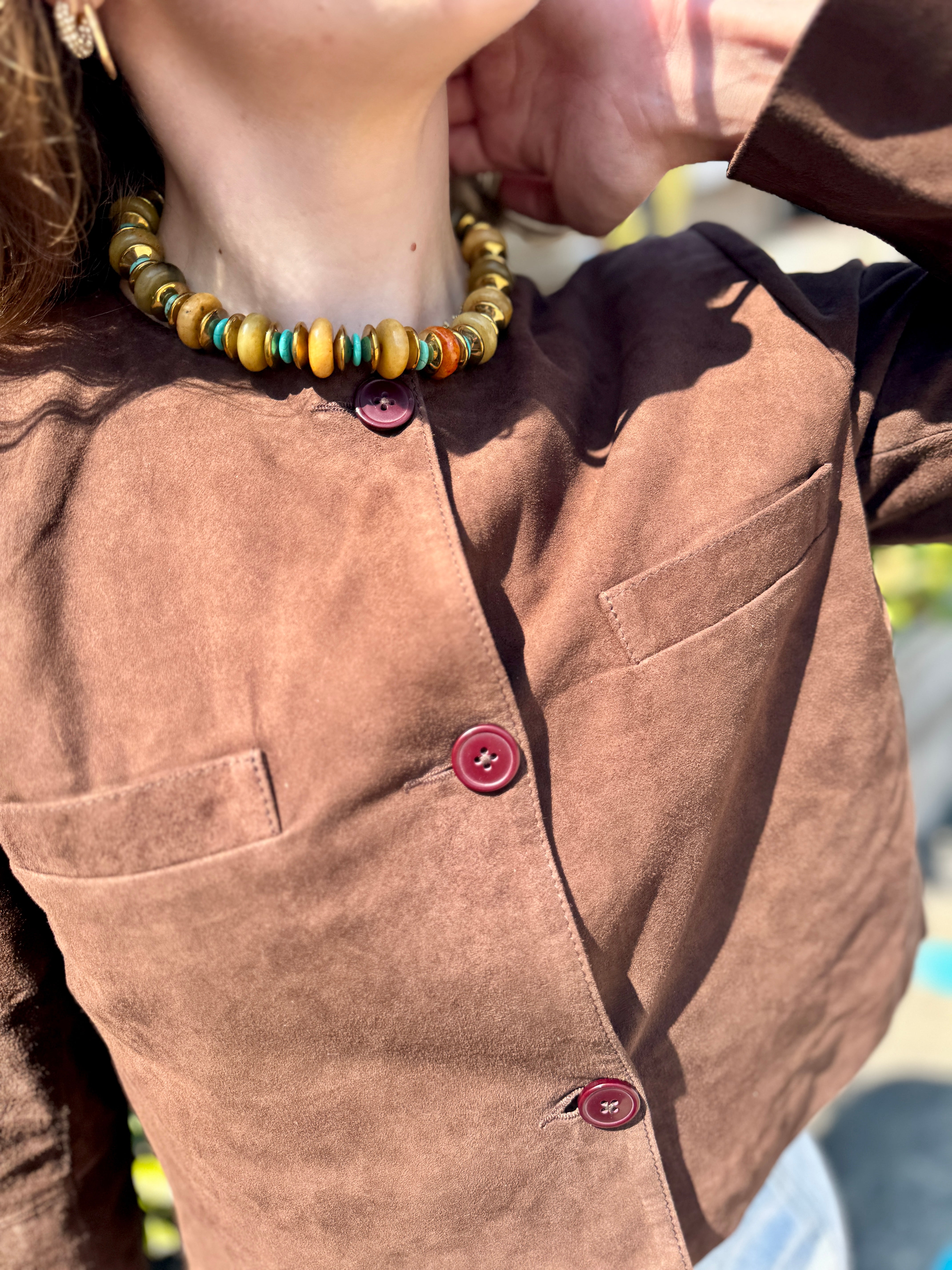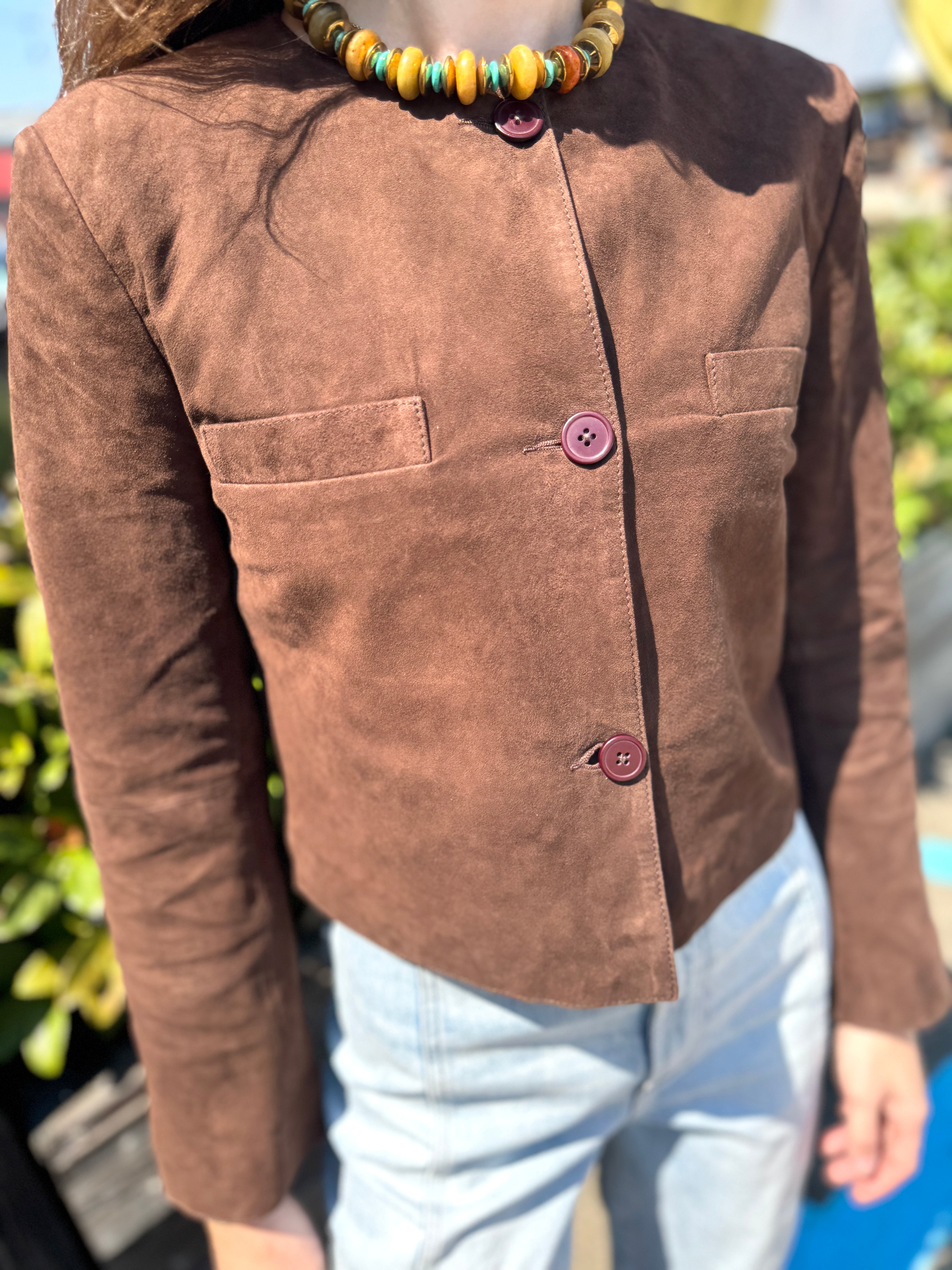The Glenda Jacket offers a casual yet polished look with its rich chocolate brown suede material. Featuring a cropped length and structured silhouette enhanced by shoulder pads, this jacket adds subtle definition to your outfit. Perfect for layering, it brings a touch of effortless style and warmth to your everyday wardrobe.