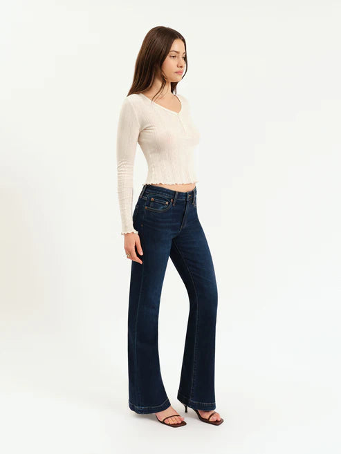 The Heartbreaker is a mid-rise flare in a classic indigo dark wash. This flattering silhouette will take you from daytime to date night with ease.o
