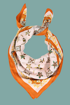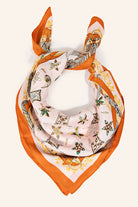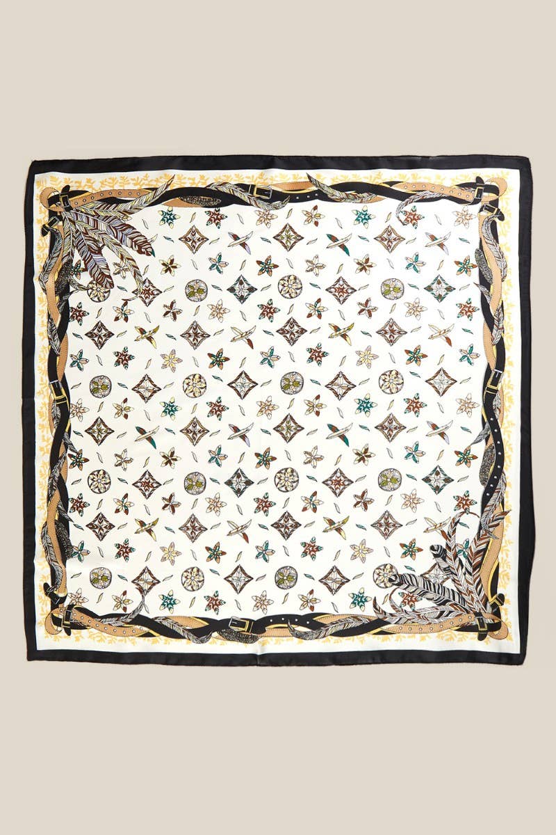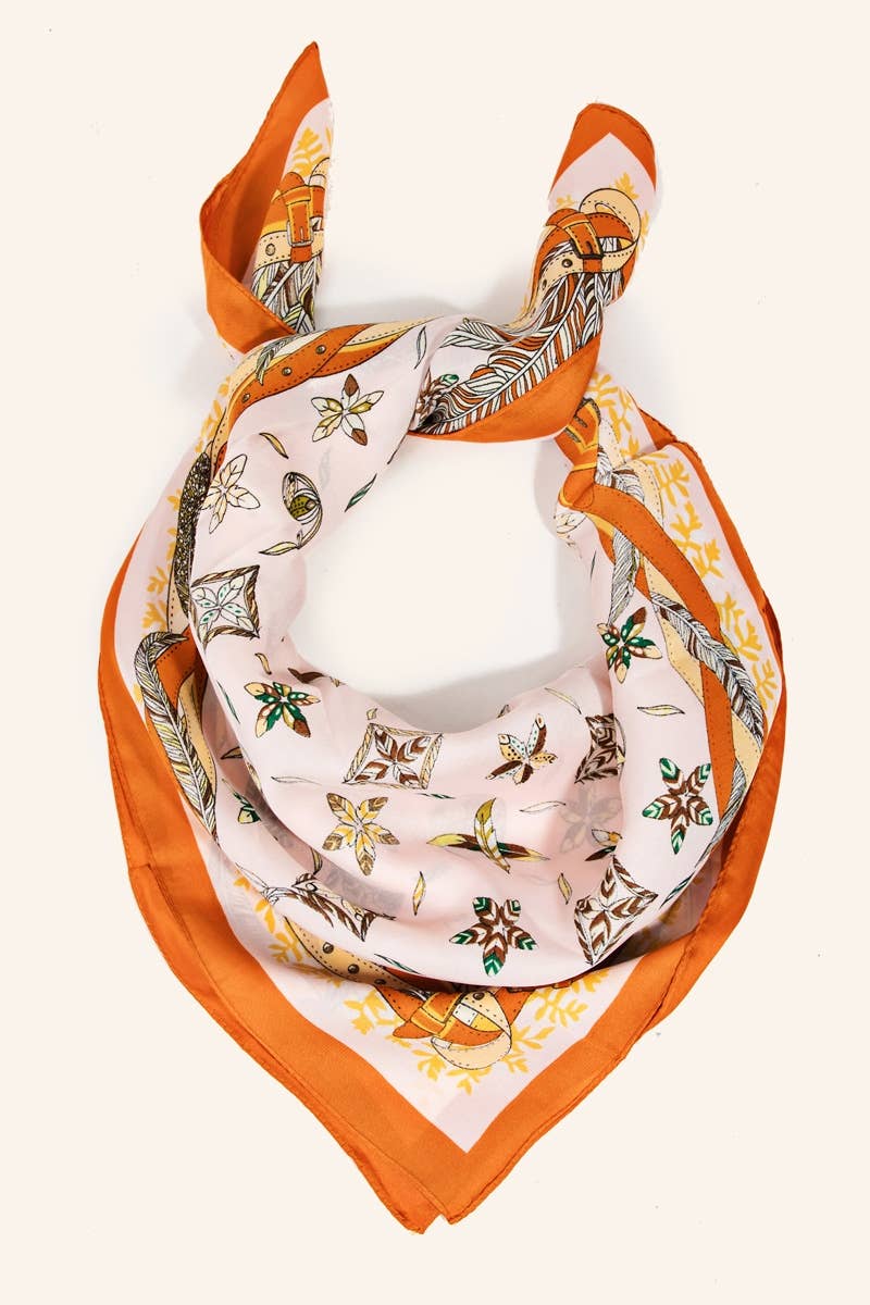 This scarf seamlessly blends timeless and contemporary styles with its exceptional multi floral star print design. Embrace its versatility and add a touch of elegance to every outfit. Available in brown, orange, and grey, this 100% Polyester scarf measures approximately 27.5 inches in both length and width.