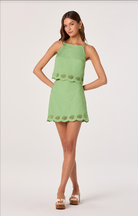 Effortless elegance meets coastal charm with the Taniya Skirt. Crafted from breathable linen, this mini skirt features a delicate scalloped hem adorned with charming seashell cutouts along the bottom. The soft green hue brings a fresh, natural feel perfect for warm-weather styling. Whether you're heading to the beach or embracing a relaxed summer aesthetic, this piece combines comfort with whimsical detail for an unforgettable look.