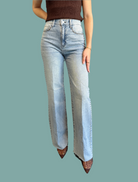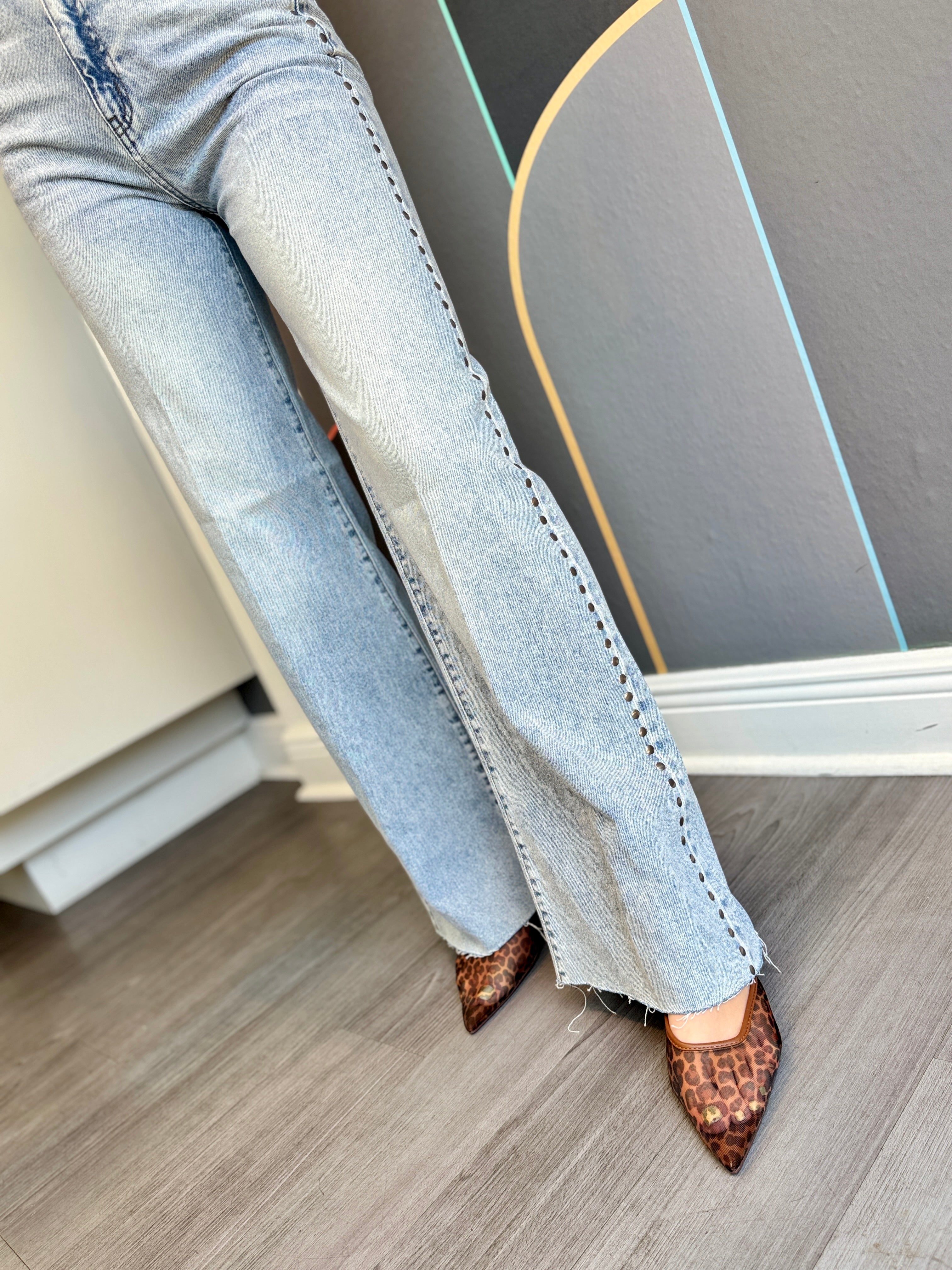 Step into the spotlight with these light wash wide leg jeans featuring a playful raw hem and sparkling studs lining both outside seams. The high-rise fit flatters your silhouette while adding a fun, retro vibe to your look. Perfect for dancing through the day or night, these jeans bring effortless style and a touch of sparkle to every move.