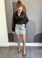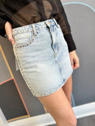 Get ready to turn heads in the Stash Mini Skirt High Rise - Let's Dance! This light wash denim skirt features a fun finished hem and edgy studs lining each outside seam and pockets, adding just the right amount of sparkle to your look. Perfect for dancing the night away or casual days out, its high-rise fit flatters your silhouette while keeping comfort in check. Add a playful twist to your wardrobe with this standout mini skirt!