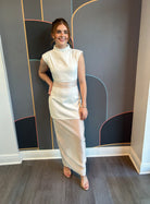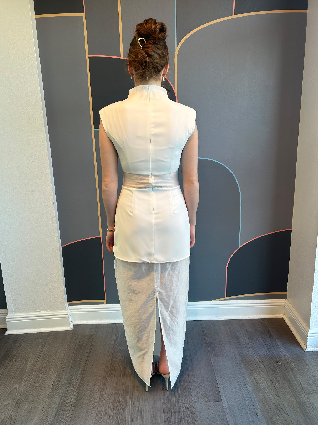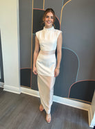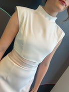 Unleash your inner Bond with this striking Bond Dress in White. A unique blend of luxurious suiting fabric and delicate contrast organza creates a modern yet refined look. The structured silhouette, high mock neckline, and ethereal organza skirt make this dress perfect for any occasion. Timeless sophistication with a touch of boldness.