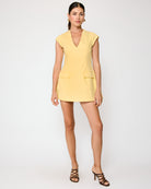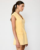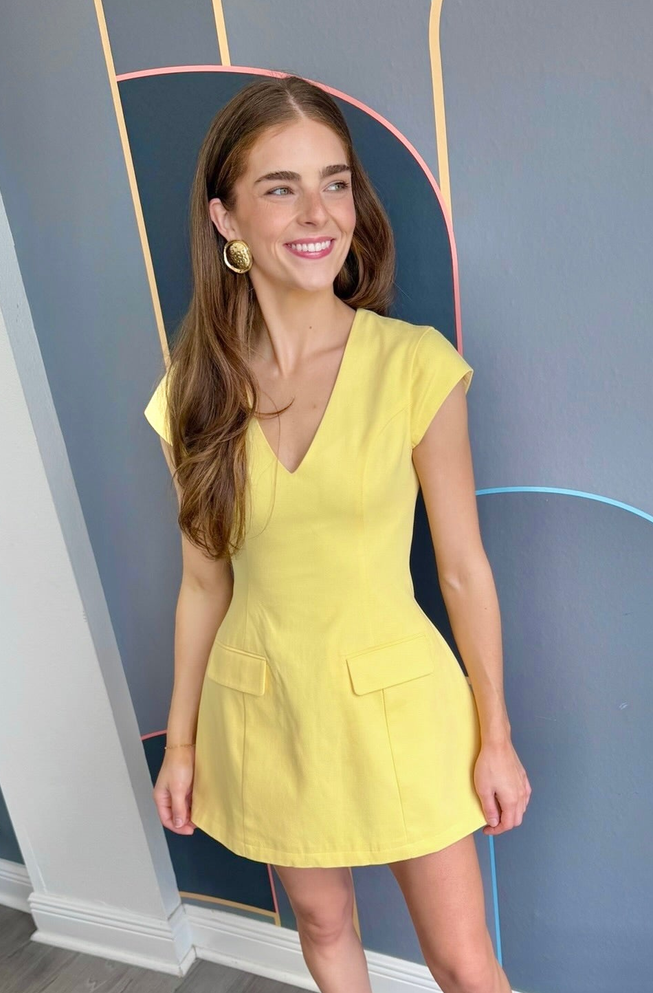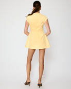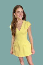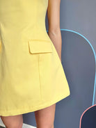 The Eleodra Mini Dress combines comfort with playful style. Crafted from a breathable cotton-lined interior with a durable polyester-cotton blend exterior, this cheerful yellow dress features a flattering V-neckline and cap sleeves for an effortless silhouette. Functional faux front pockets add practical charm, while a hidden back zipper ensures easy on-and-off wear. Perfect for casual outings or weekend adventures.