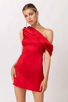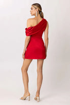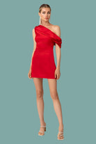 This flirty red mini dress features a unique shoulder design and a convenient side zipper. Made from a blend of polyester and spandex, it offers both style and comfort. Lined with 100% polyester, it's perfect for any occasion.