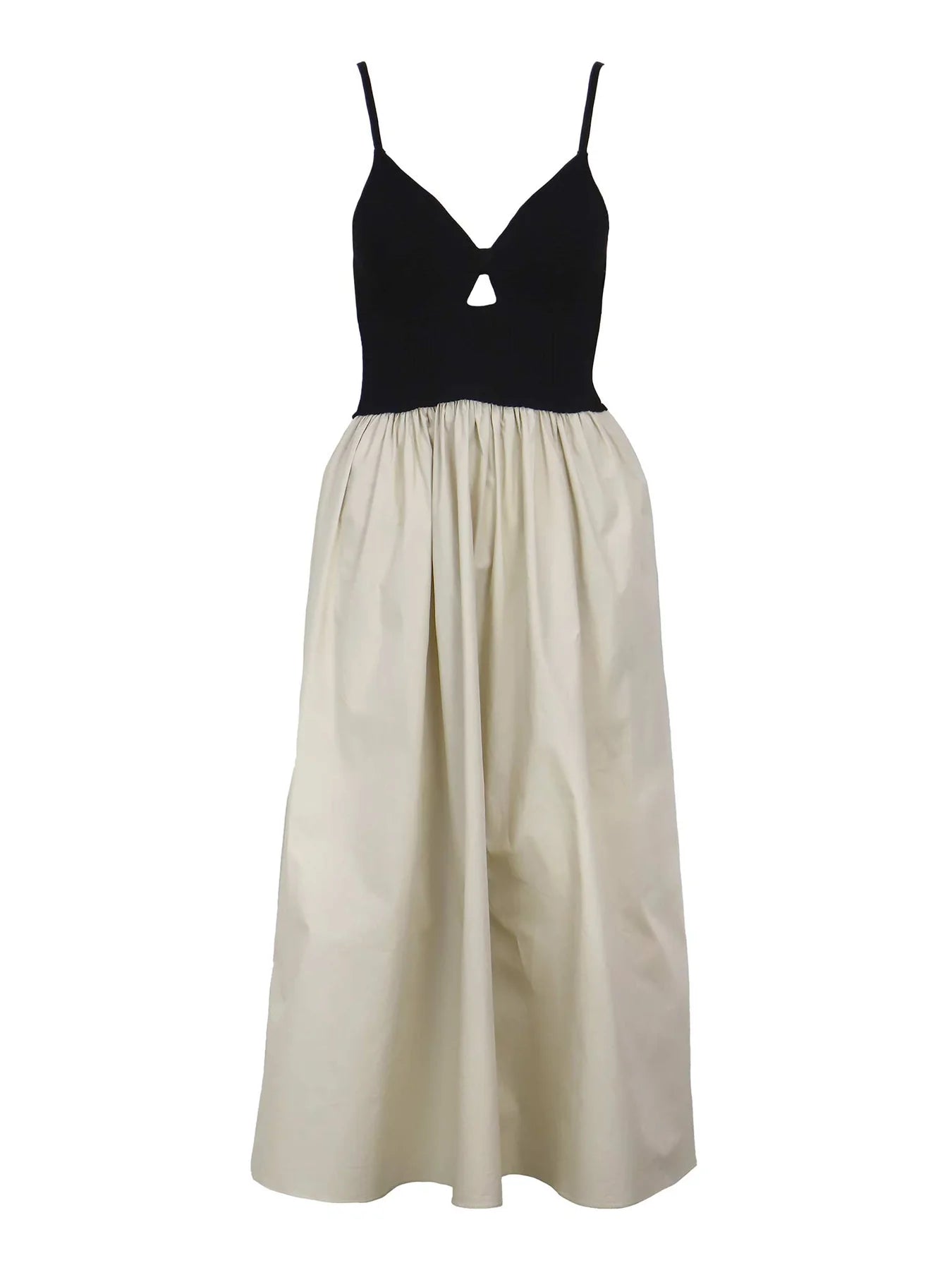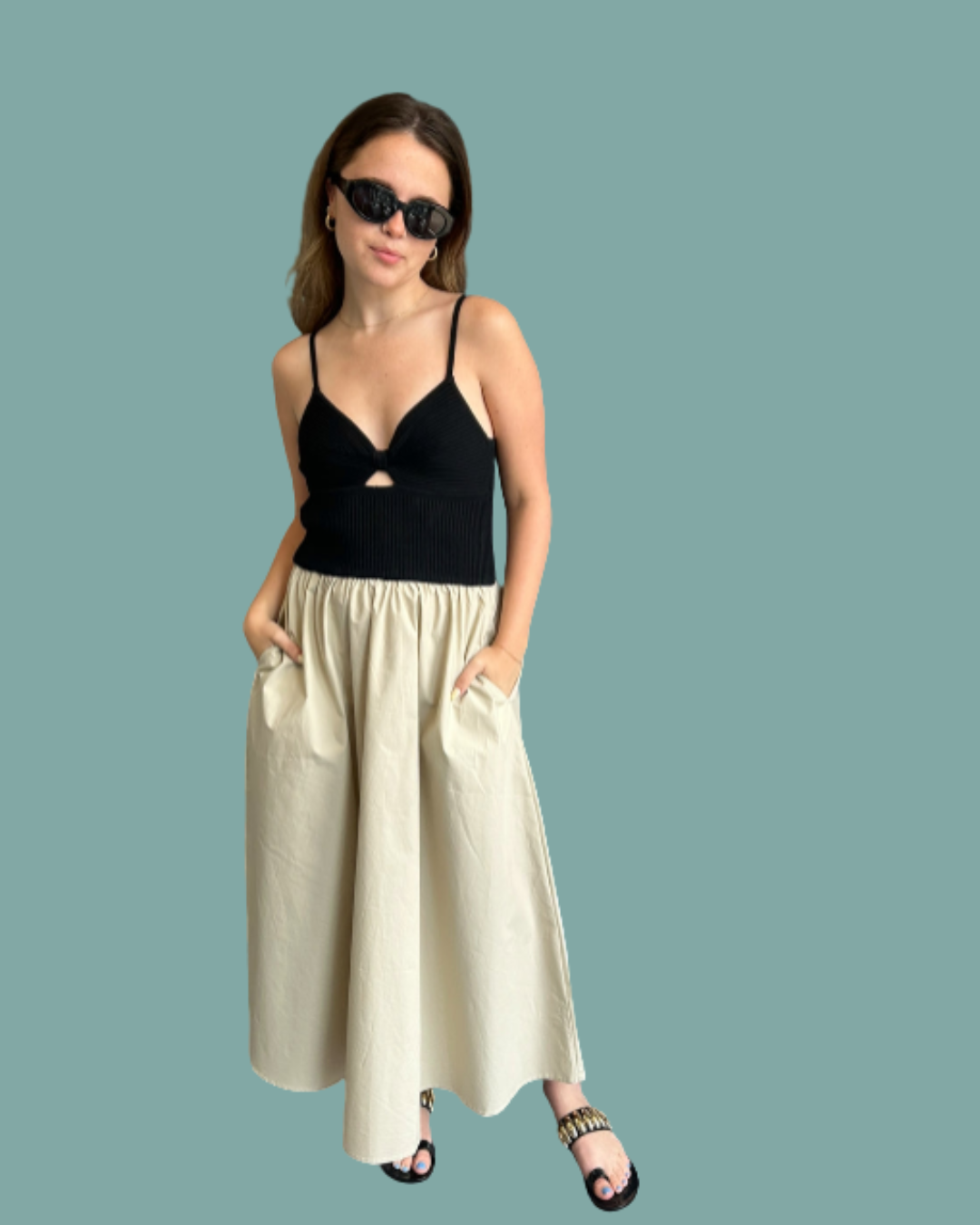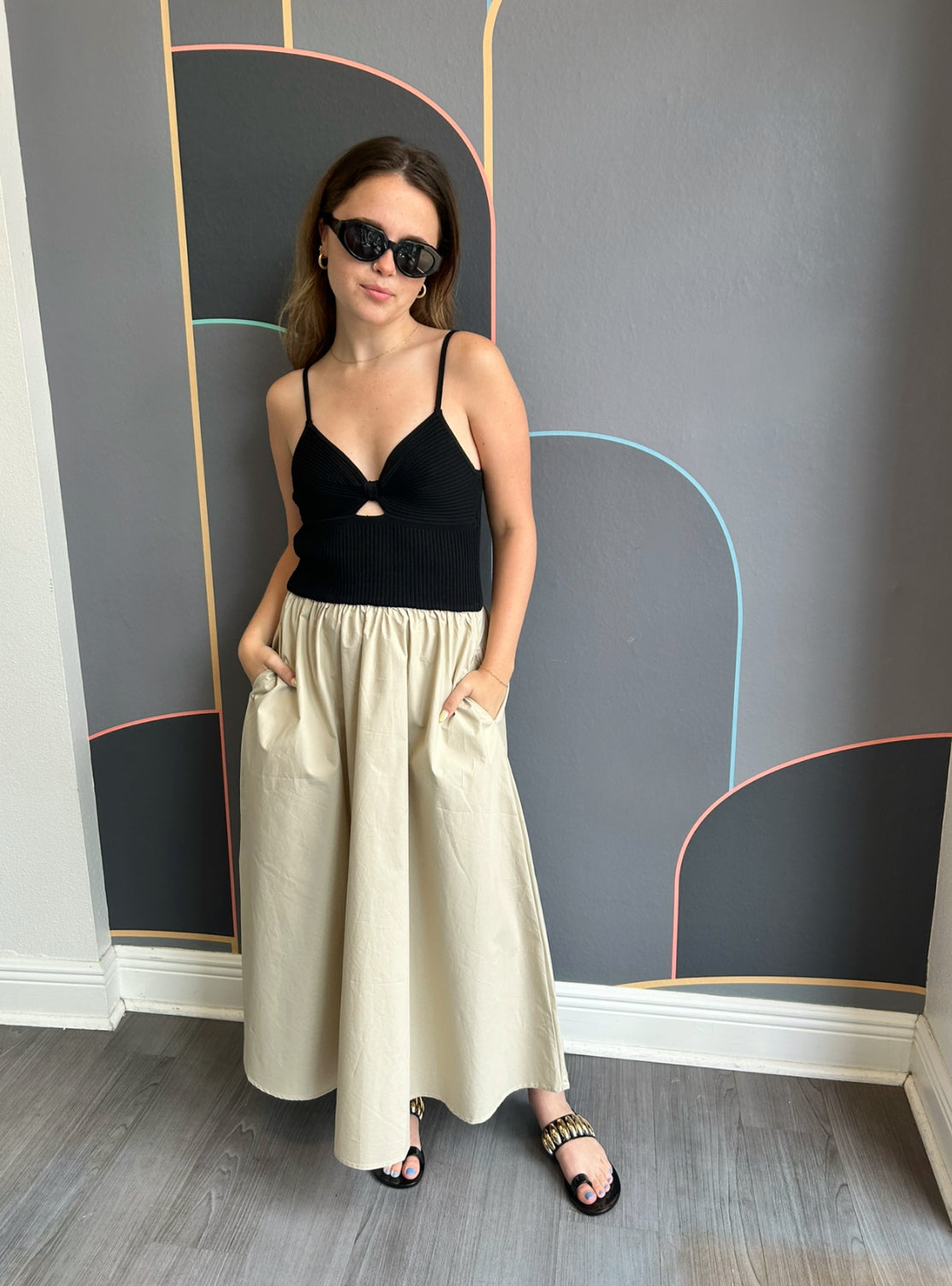 Chic, sleek, and effortlessly refined—meet your new favorite statement piece. The Madrid Mixed Media Dress features a fitted black bodice with a keyhole detail and adjustable straps, paired with a full, gathered tan skirt for the perfect contrast of structure and softness.