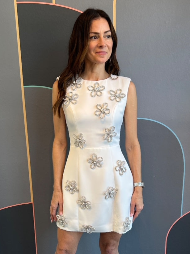 The dress is adorned with stunning 3D diamante flower detailing, adding a touch of sparkle and sophistication that makes it ideal for special occasions or a night out on the town. Each flower catches the light beautifully, creating a mesmerizing effect that will turn heads wherever you go.