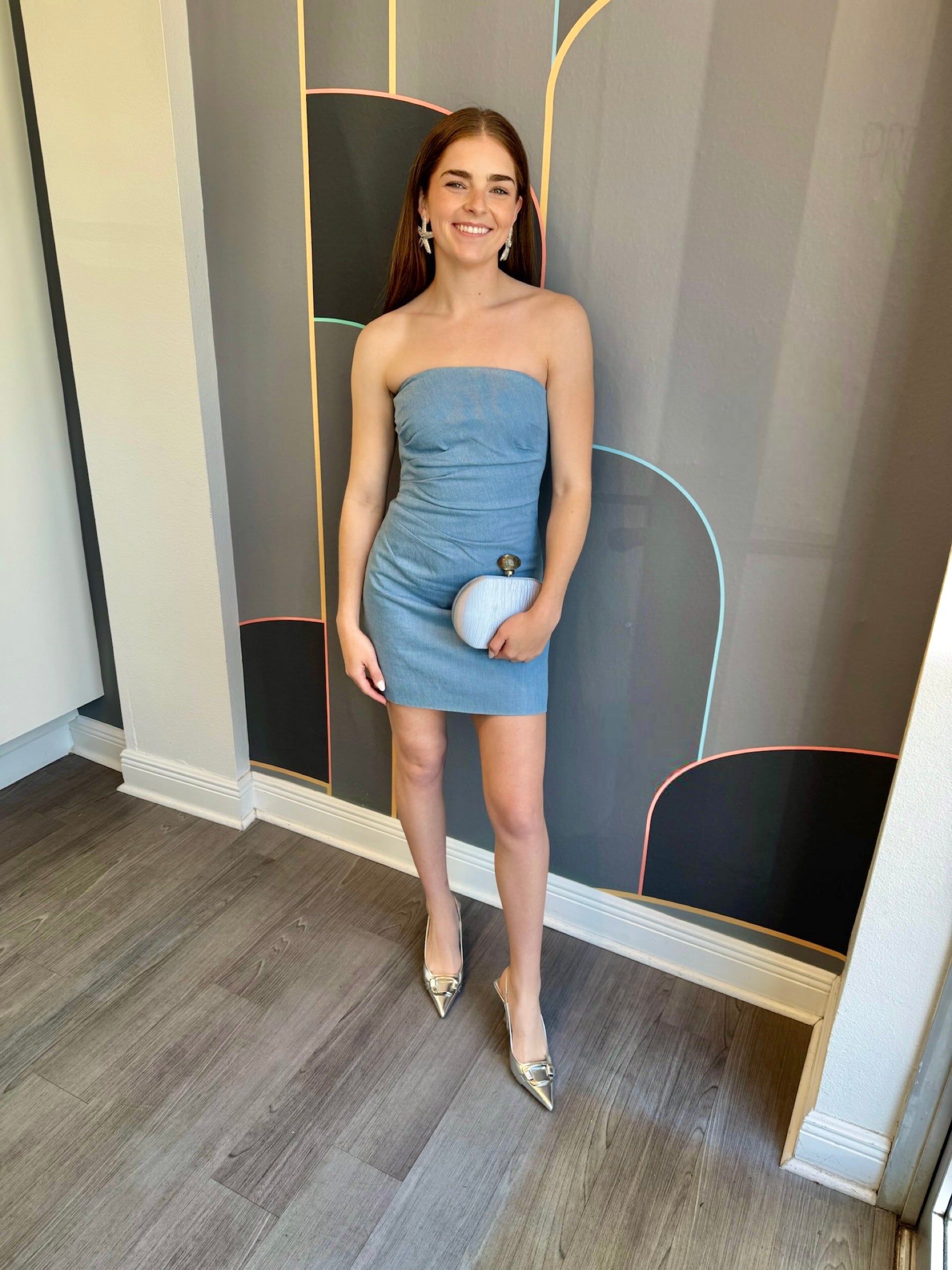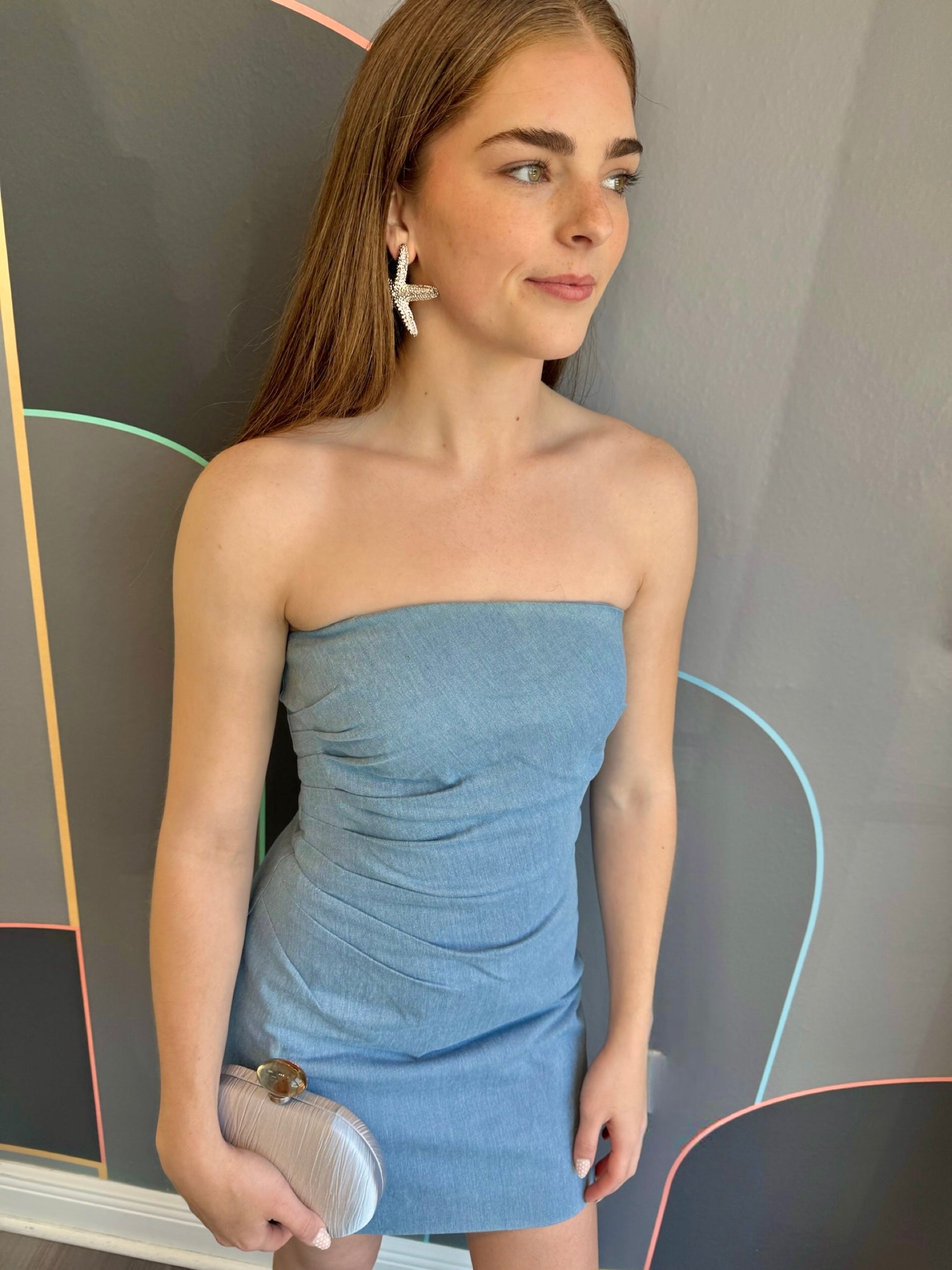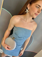 Turn heads in the Mazzei Dress, a strapless denim mini with subtle ruching for added flair. The no-slip grip tape ensures a worry-free fit, and the fully lined design includes a hidden back zipper for seamless style. Made of a cotton-poly blend, it's a must-have for your wardrobe.