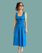 Look effortlessly chic in the Saint James Dress. With its scoop neck and ruched torso, this blue or lime midi dress accentuates your curves in all the right places. The tight bodice and flared waist and hips create a flattering silhouette. Perfect for any occasion, this dress is a must-have for your wardrobe.