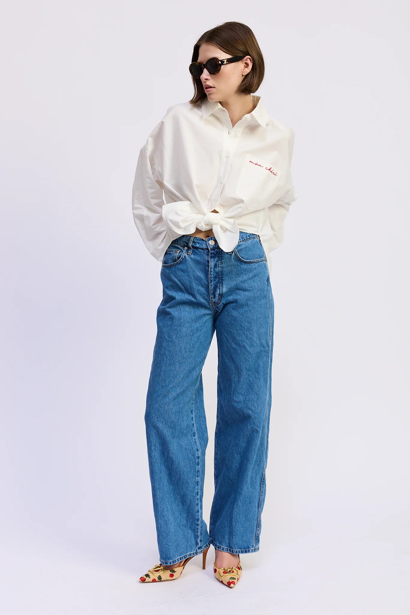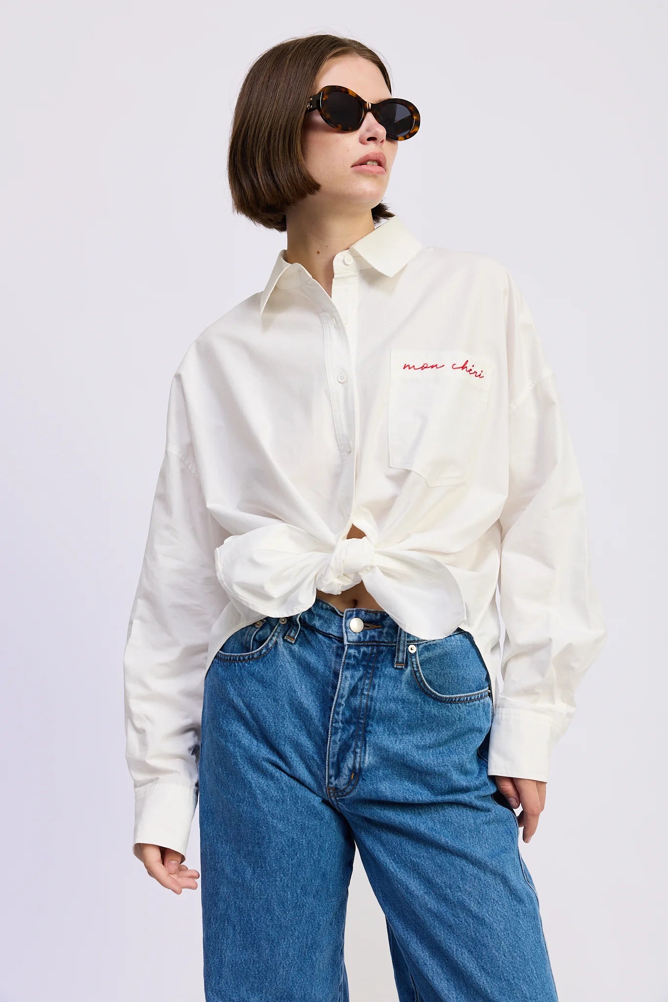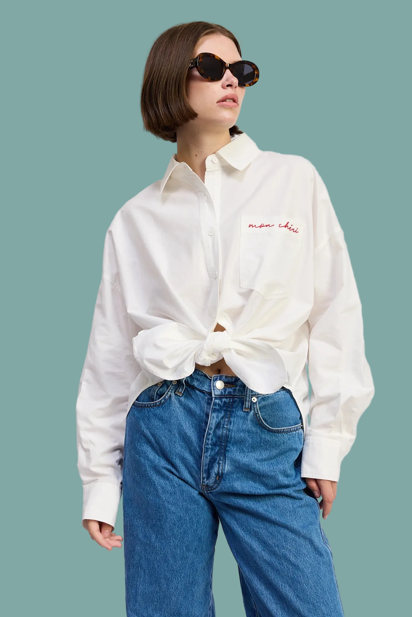 Effortless style meets comfort in this oversized shirt crafted from a luxurious 50% cotton and 50% lyocell blend. The soft, breathable fabric drapes beautifully while maintaining its shape, perfect for layering or wearing solo. Featuring embroidered text detailing that adds a personalized touch, this imported piece is a versatile wardrobe essential. Hand wash to preserve the quality and longevity of this statement piece.