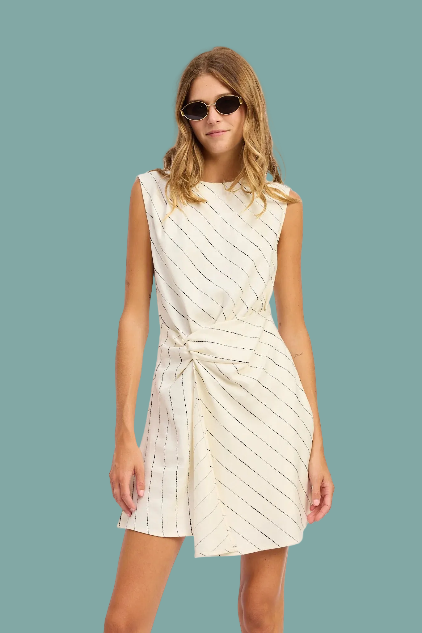 Crafted from a breathable linen and viscose blend, this mini sheath dress features elegant ruched draping and strategic stripe placement for visual interest. The fully lined design ensures comfort and coverage, while the flattering silhouette works for both casual outings and dressed-up occasions. Hand wash and imported for quality construction. Model pictured is 5'9" wearing size small.