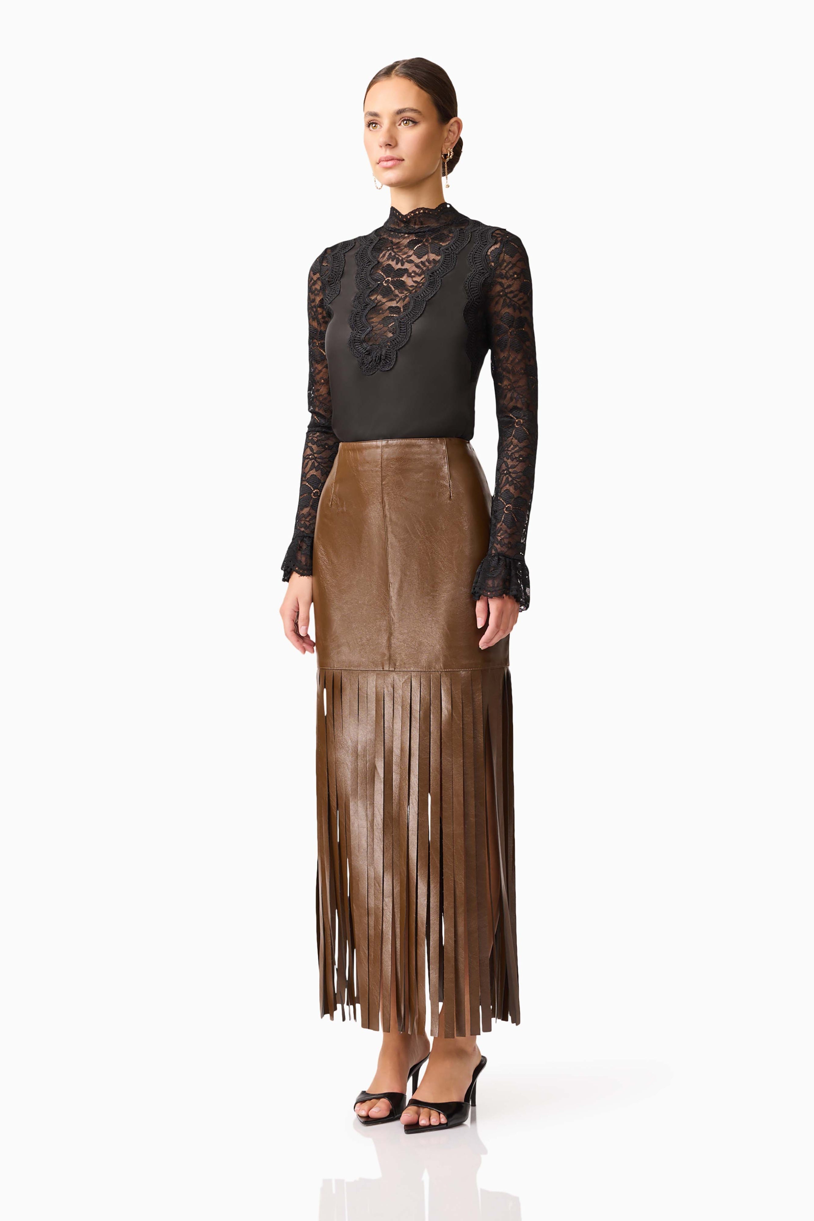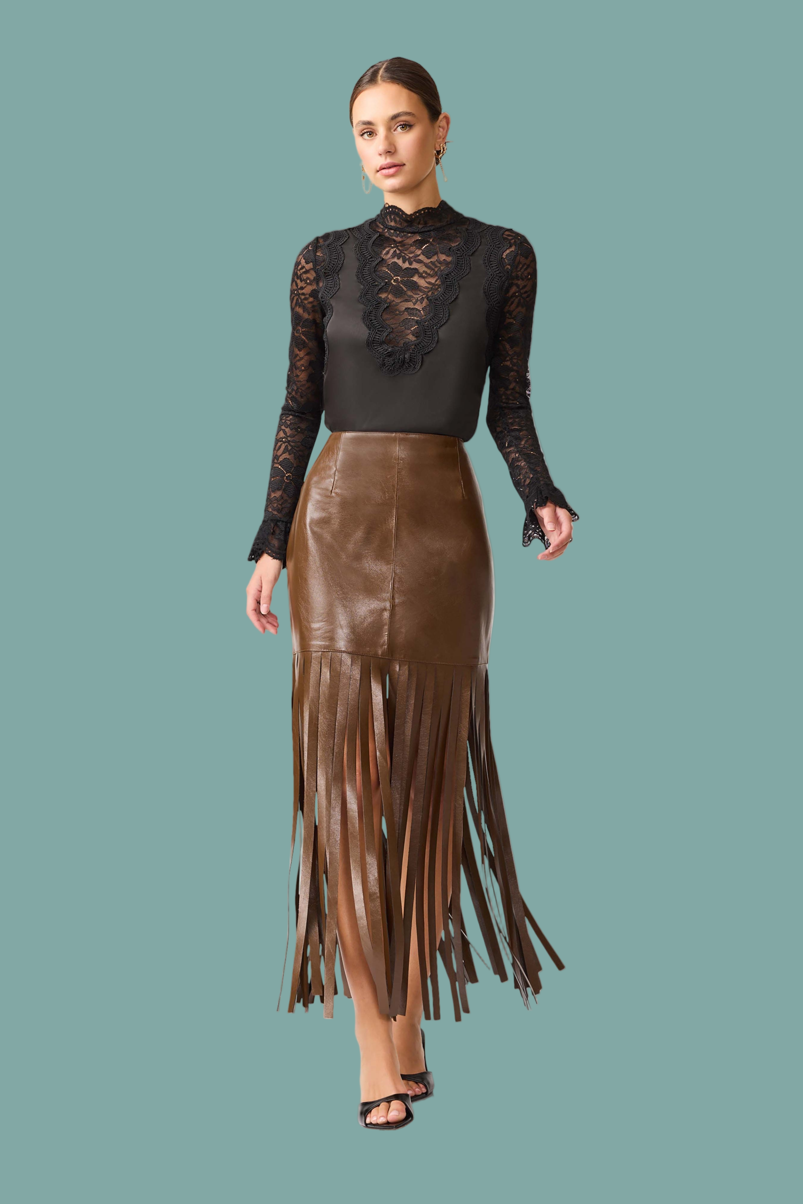 Slip into this chic chocolate vegan leather skirt featuring a flattering high waist, playful tassel detailing along the hem, and a convenient zipper closure for easy wear.