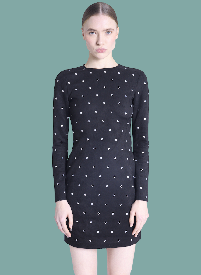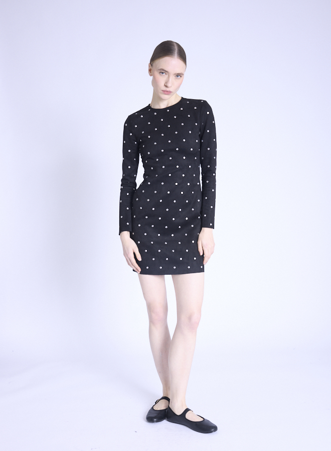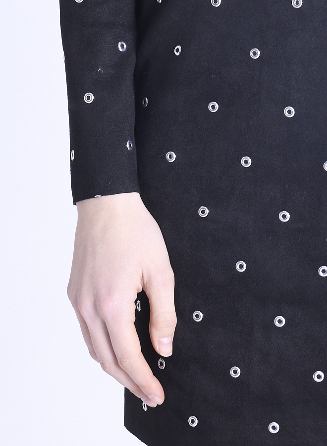 The Court Suede Rivet Dress offers a sleek, casual look with its soft suede fabric and eye-catching rivet details. Featuring long sleeves and a mini length, this black dress combines comfort and style for everyday wear or nights out. Its design ensures you stay effortlessly chic while enjoying all-day ease.