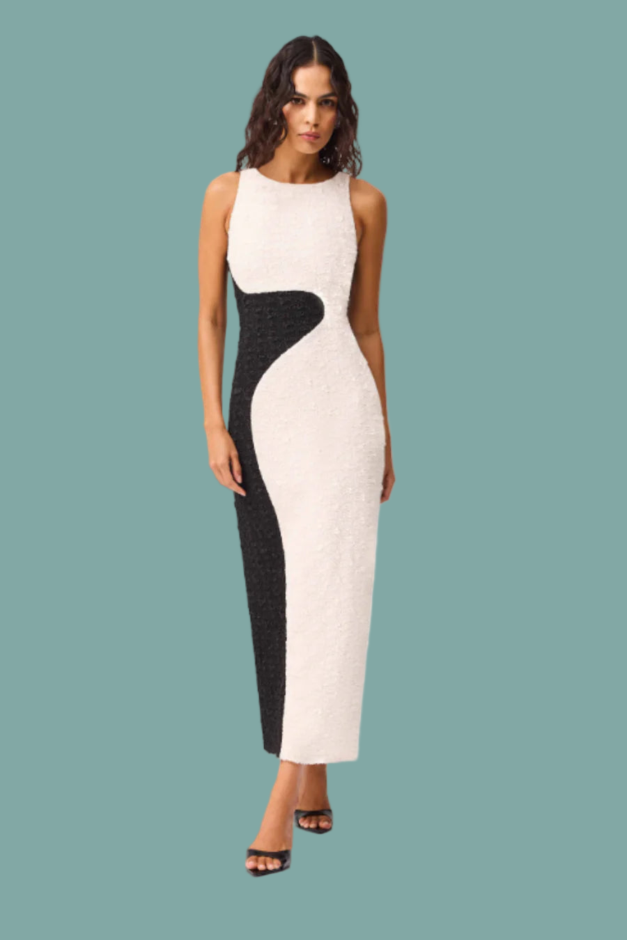 This sleeveless fitted Paloma Gown features a striking split black and white design on the front, complemented by a solid black back for a sleek look. The hidden back zipper ensures a smooth silhouette and easy wear. Perfect for casual occasions, this dress combines bold style with comfortable fit.