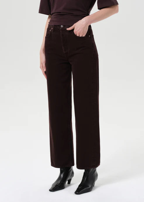 AGOLDE’s Ren Jean offers an elevated take on the classic wide-leg silhouette. Made from 100% rigid, non-stretch regenerative cotton, these high-rise jeans feature a deep grape tone with brown undertones and subtle marbling. The cropped wide legs create a relaxed yet flattering fit, while the heavyweight denim ensures all-day comfort. Pair with neutral tones or a crisp white top for a polished look.
