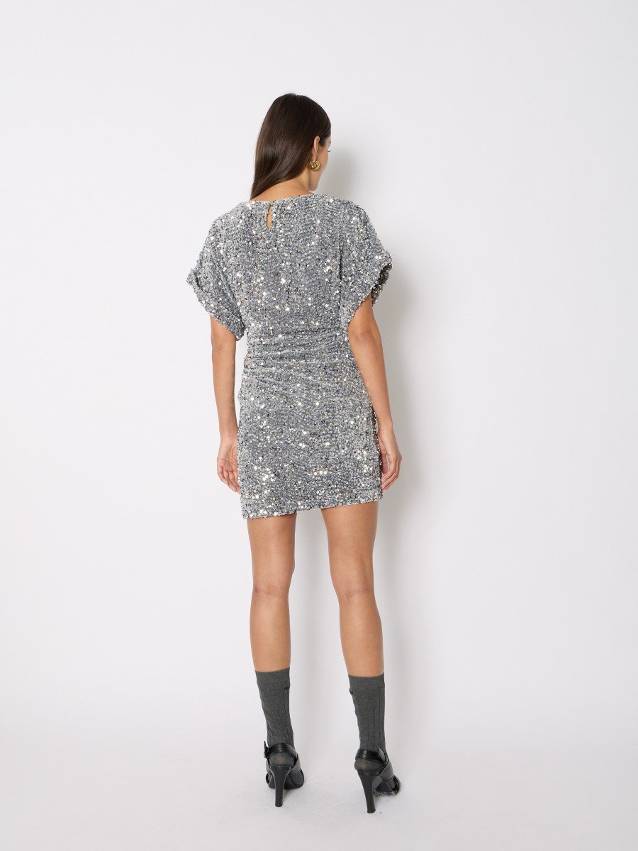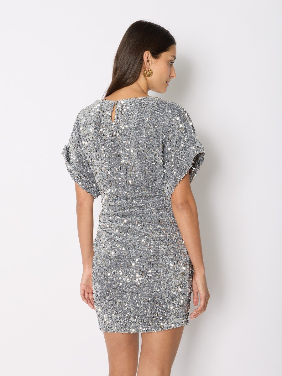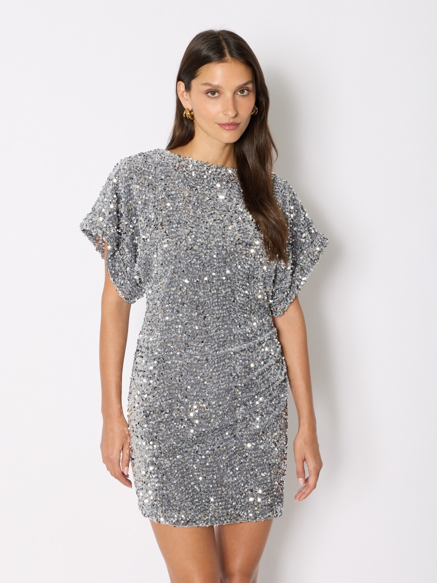 The Rihanna Sequin Mini Dress stands out with its structured volume and wide sleeves, giving it a modern, confident vibe. Covered entirely in silver sequins, this short dress adds instant sparkle to any outfit. Pair it with boots for an edgy twist or heels to accentuate its bold style. Perfect for making a statement at your next event.
