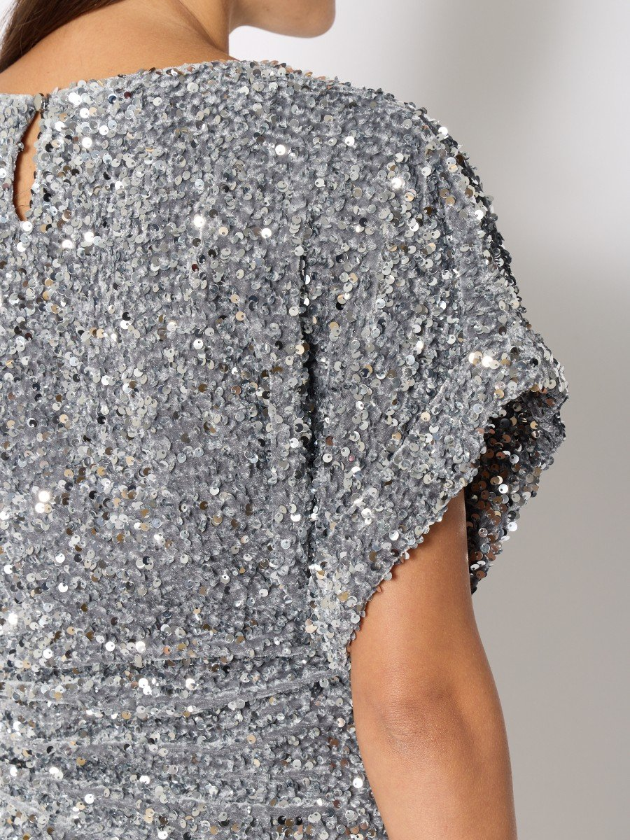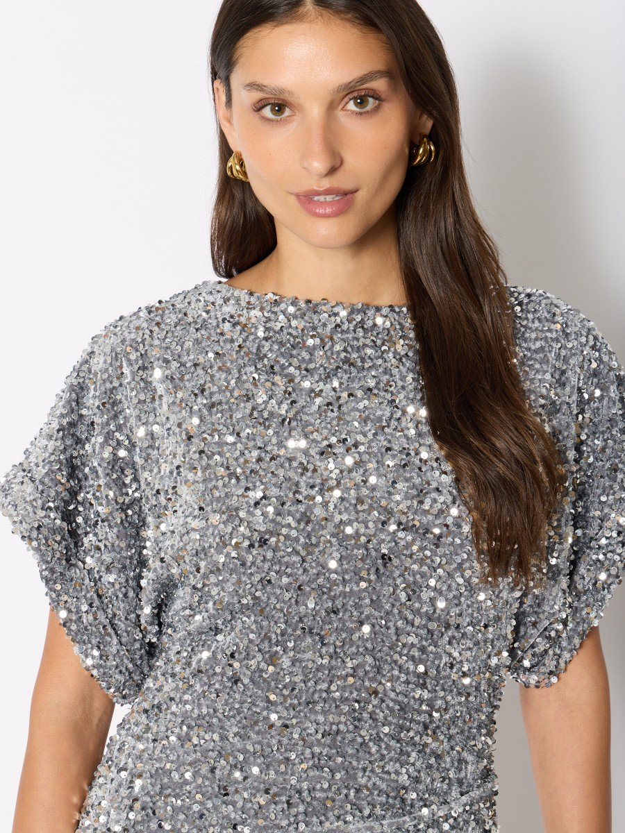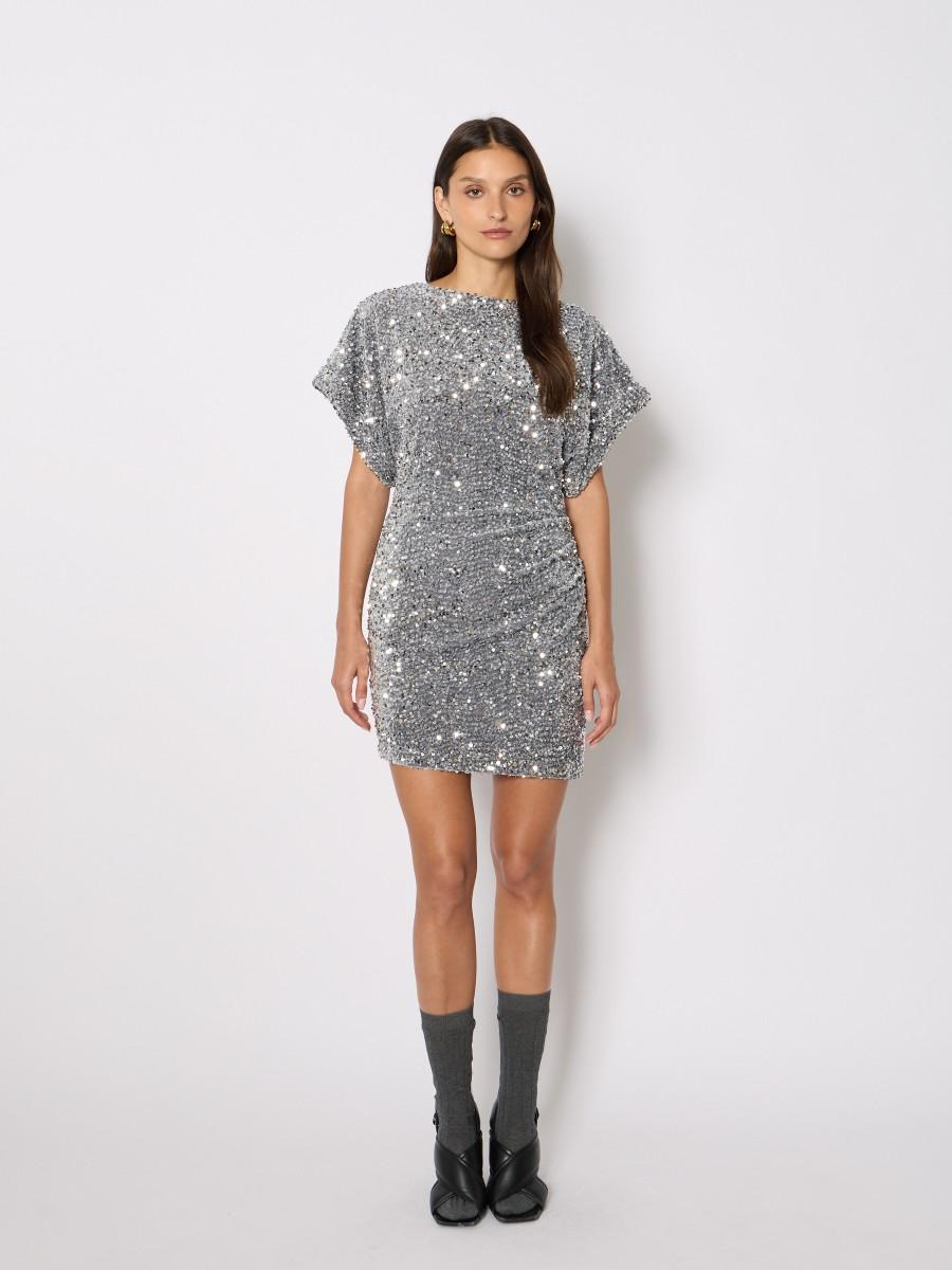 The Rihanna Sequin Mini Dress stands out with its structured volume and wide sleeves, giving it a modern, confident vibe. Covered entirely in silver sequins, this short dress adds instant sparkle to any outfit. Pair it with boots for an edgy twist or heels to accentuate its bold style. Perfect for making a statement at your next event.