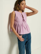 Made in a dual luxe jersey spandex fabric at the back, and pleated cotton poplin front bodice, the Ali Top is simple yet sophisticated. With an effortlessly feminine design, this sleeveless top includes a cutaway neckline with front tie detailing, and structured yoke backing for ultra comfort. This one comes in Lavender.