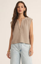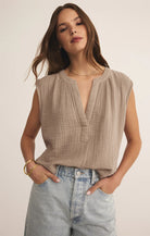 This sleeveless v-neck top is crafted from lightweight, 100% cotton gauze with soft shirring at the neckline for a touch of texture. With its breezy fit and airy feel, it's a warm-weather essential for everything from beach days to brunch.