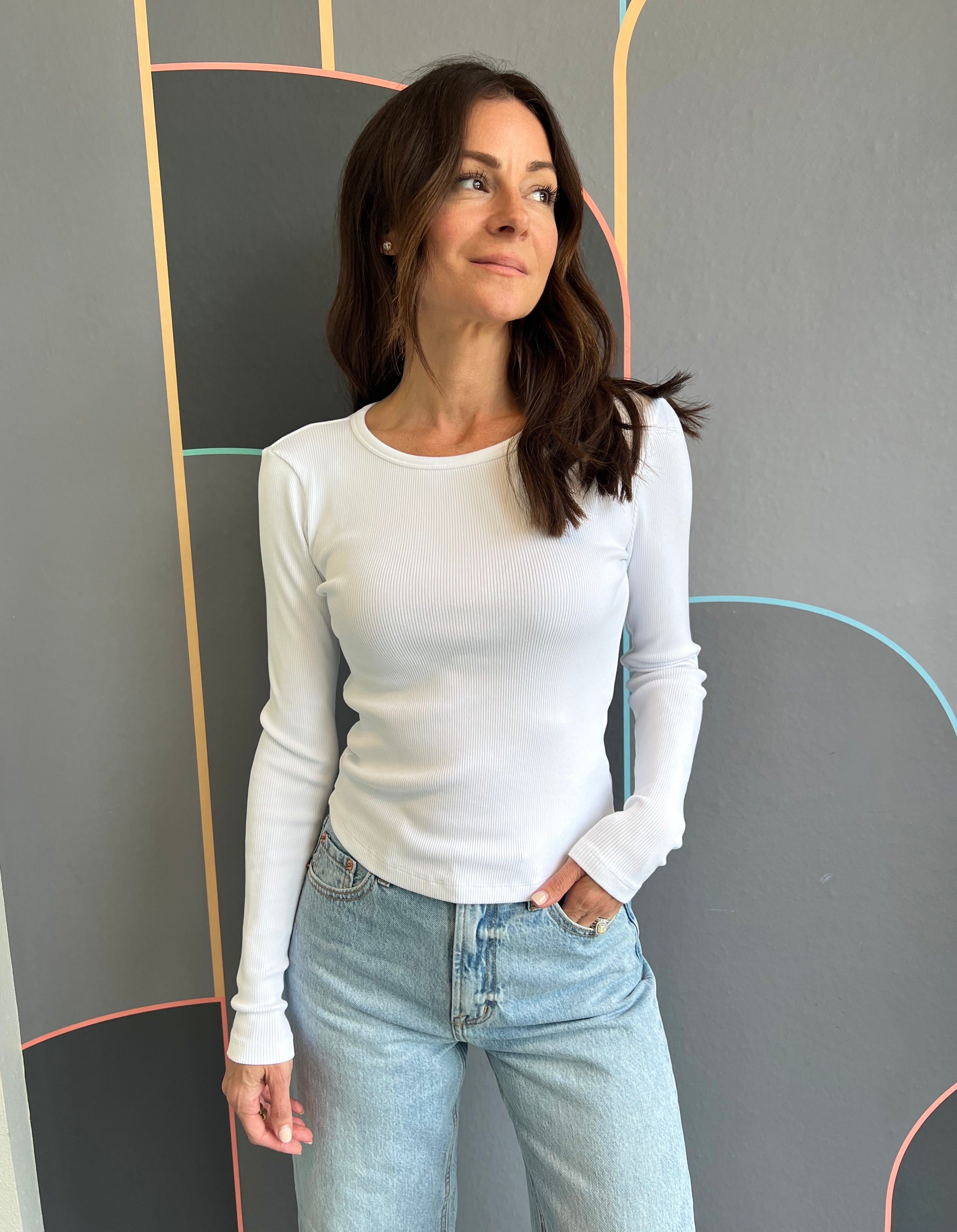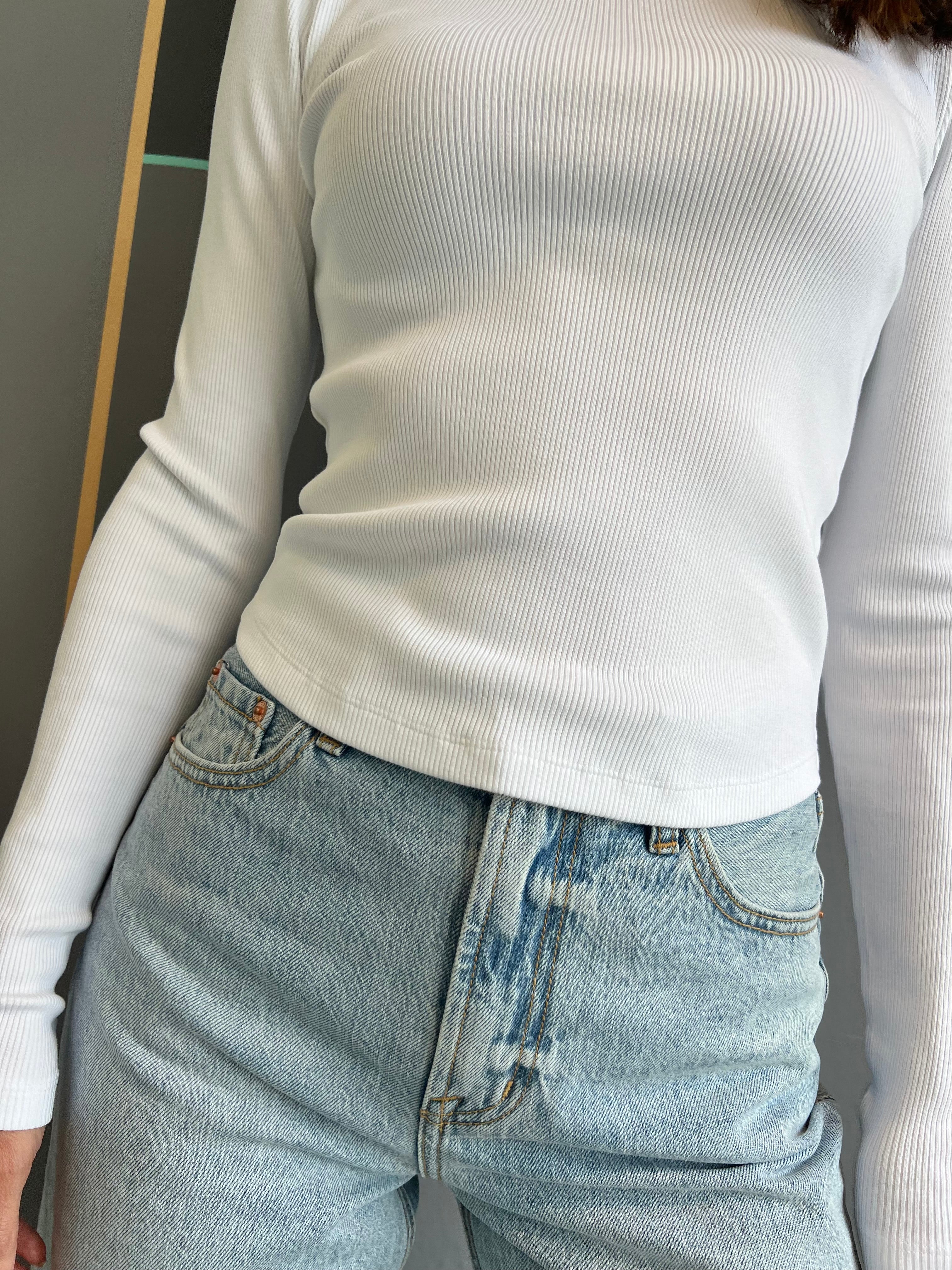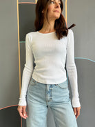 This ribbed crewneck long-sleeved tee in crisp white is your new go-to for effortless style. With its cozy ribbed texture and playful curved hem, it adds a fun twist to a classic look. Perfect for layering or wearing solo, it’s comfy, cute, and ready to brighten up any outfit!