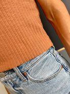 This playful cropped rib tank in a warm chai hue features a trendy raw hem for a laid-back, effortlessly cool vibe. Perfect for layering or wearing solo, it adds a touch of casual charm to any outfit.