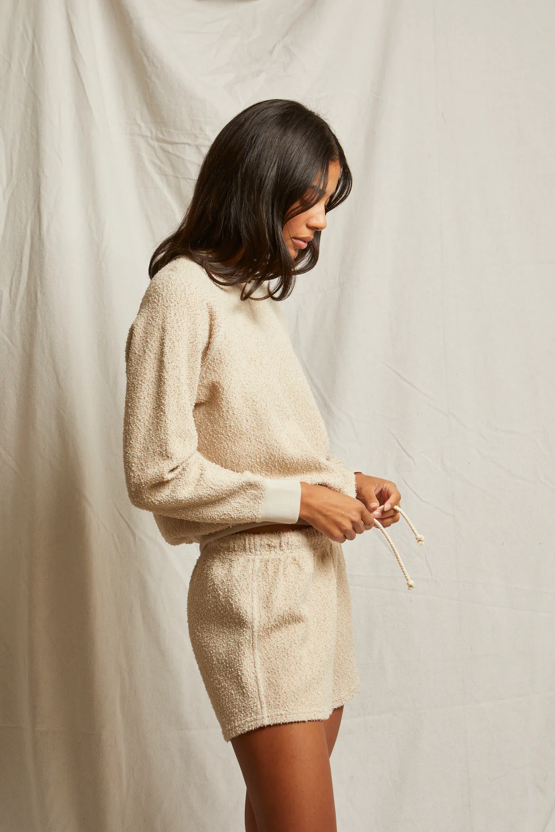 the dani short is made from the same fresh summer boucle as the sami sweatshirt and fits like the best selling layla short. so yeah, it’s basically a match made in lounge heaven. with an easy elastic waistband and a rope drawstring that says “i tried” (but not too hard), these are the shorts you’ll be living in.