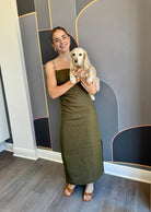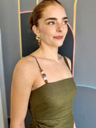 This army green midi dress features a single beaded strap that adds a touch of sparkle to your look. Designed with side ruching and an elastic back section just below the bust, it offers a flattering fit that moves with you. A discreet side zipper ensures easy wear, while the side slit adds a playful hint of allure. Perfect for turning heads with effortless style.