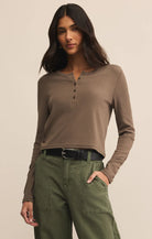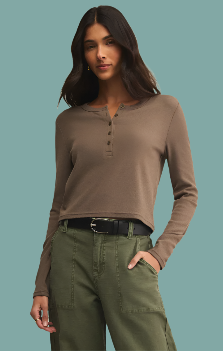 A slightly boxy, cropped henley that keeps things casual but polished. Made with a soft, slub rib knit and finished with a crew neckline, button front, and long sleeves, it’s the kind of top you’ll reach for on repeat.