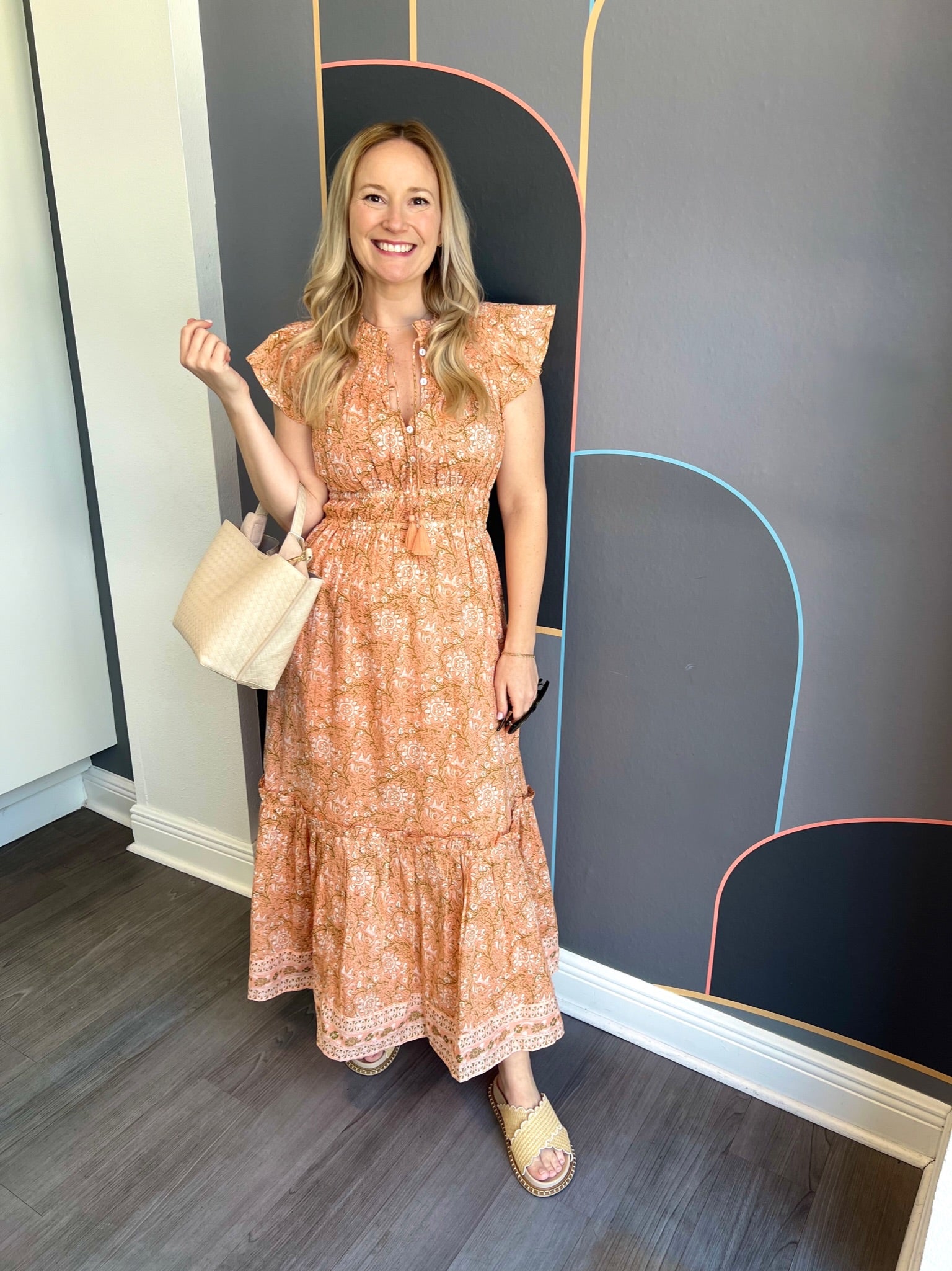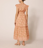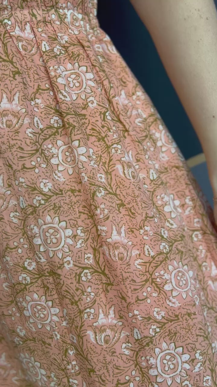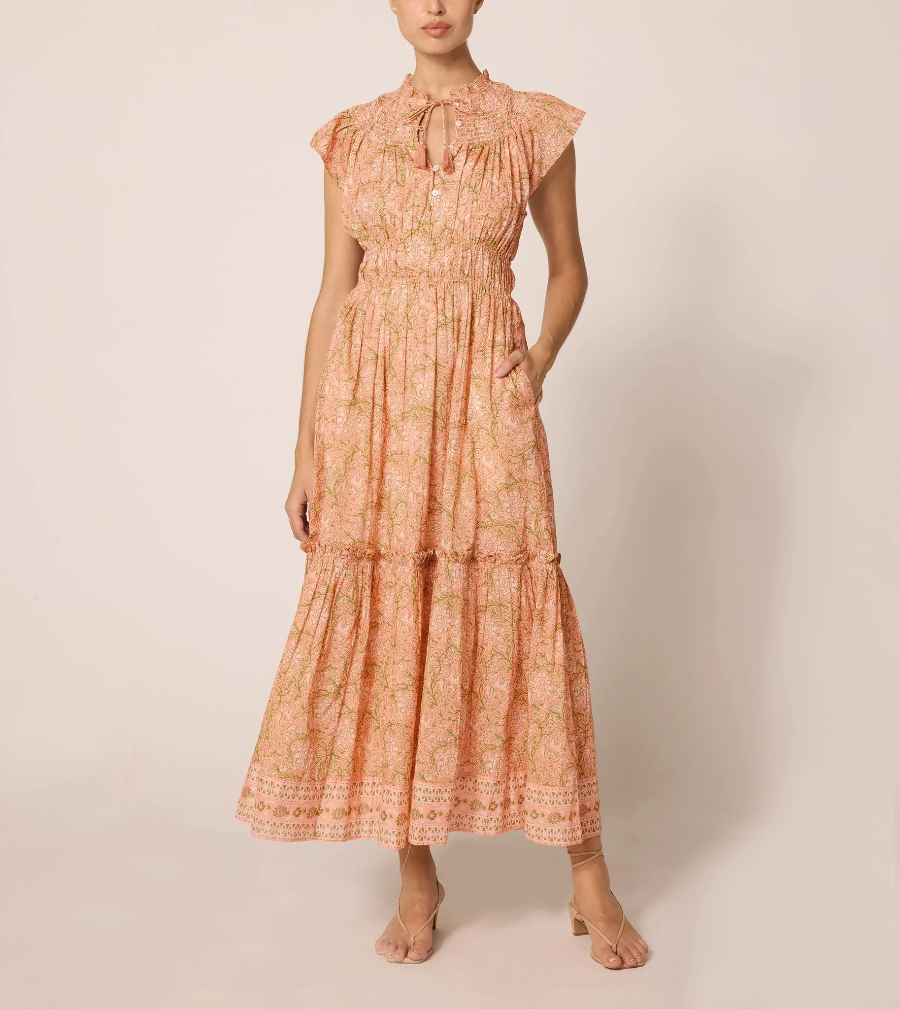 Ethically handmade in India from GOTS certified organic cotton mul mul, the Indira Ankle Dress features a high neck smocked neckline and flutter sleeve. The elastic waistband creates a flattering yet comfortable silhouette perfect for any occasion.