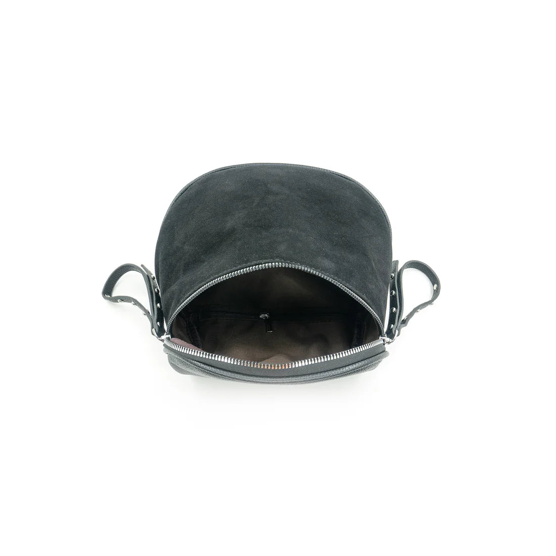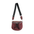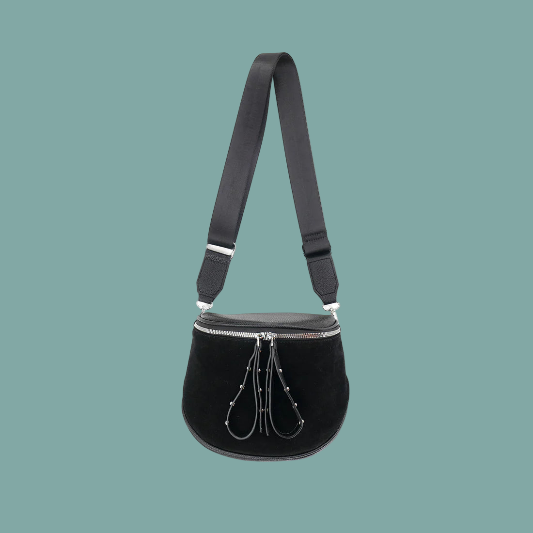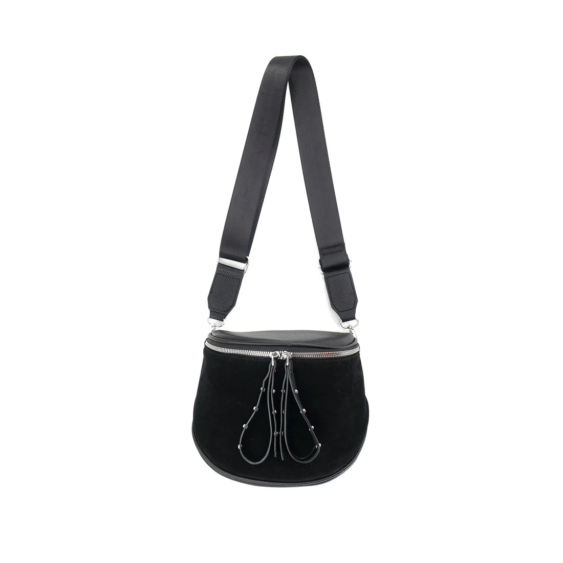 Your new favorite crossbody bag! A classic saddle style with modern studded zip pulls for a fun look. Comes with nylon crossbody strap. Silver hardware.
