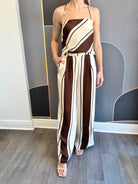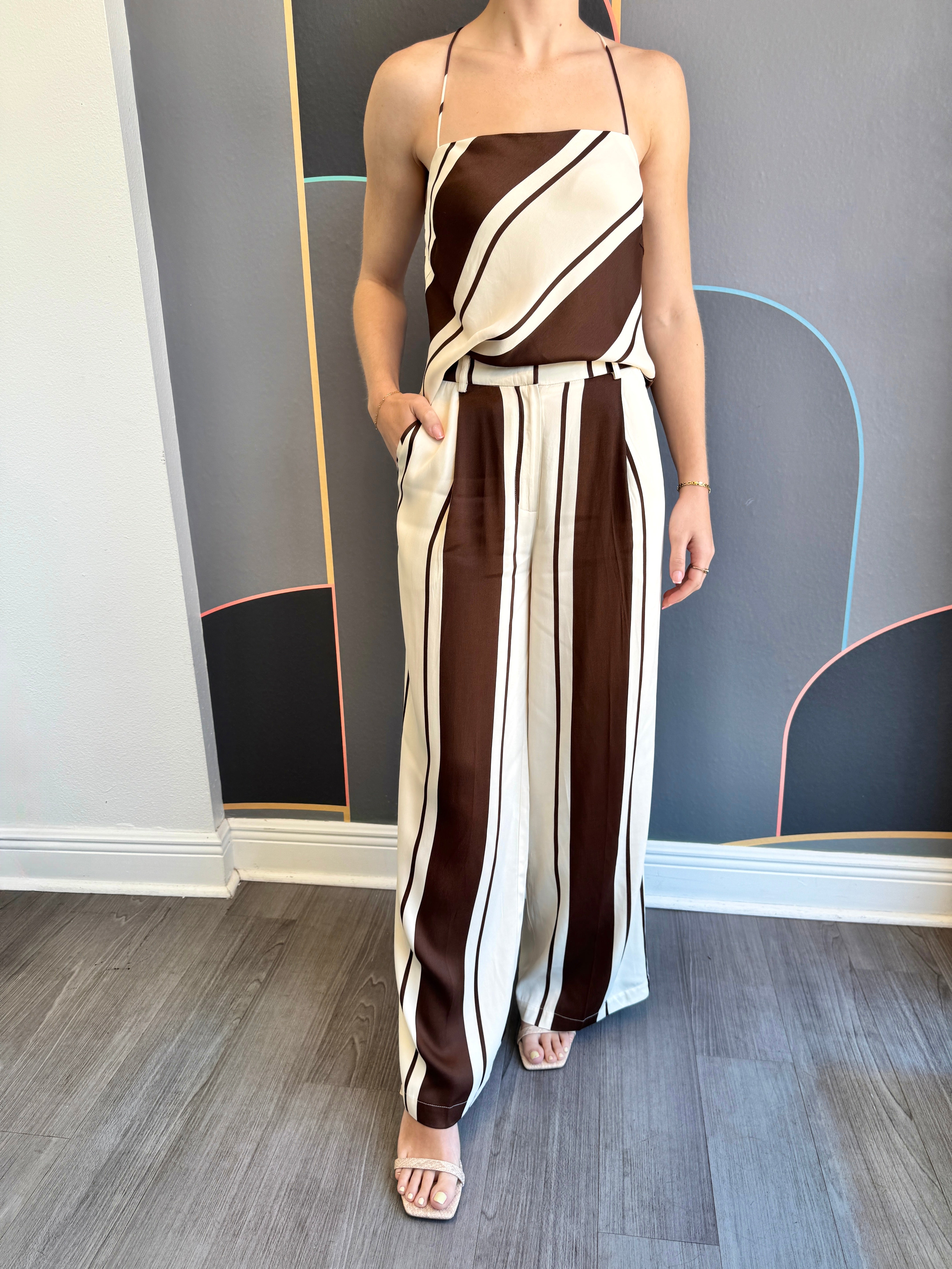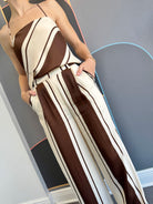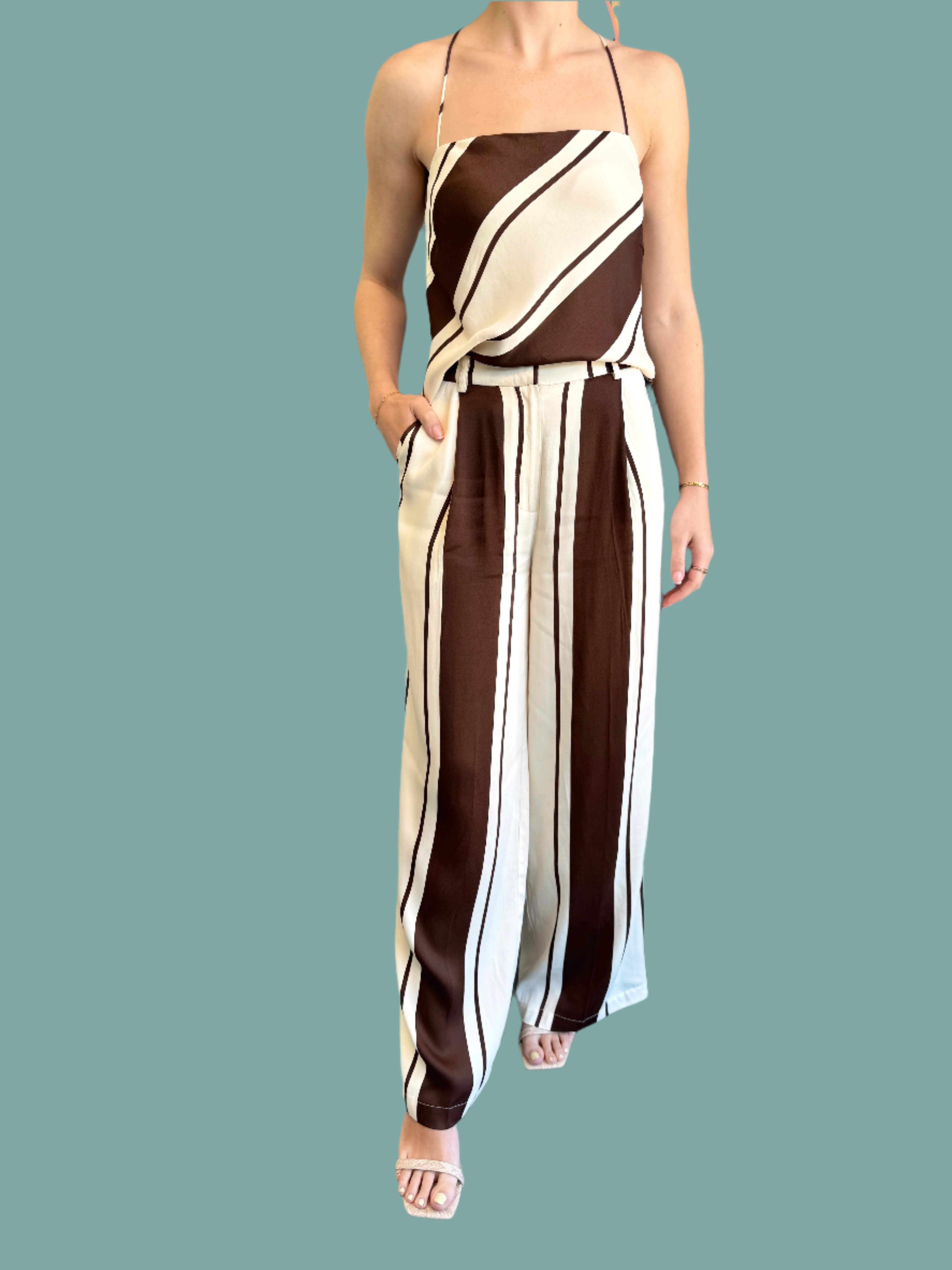 Step into effortless style with the Maisy Pant, featuring a playful striped satin-like fabric in warm brown and creamy white tones. Paired perfectly with the Allie tank top, this set offers a full-length, wide-leg silhouette with a comfortable elastic waistband, blending relaxed fit with chic appeal. Ideal for lounging or casual outings, these pants bring a touch of fun and flair to your wardrobe.