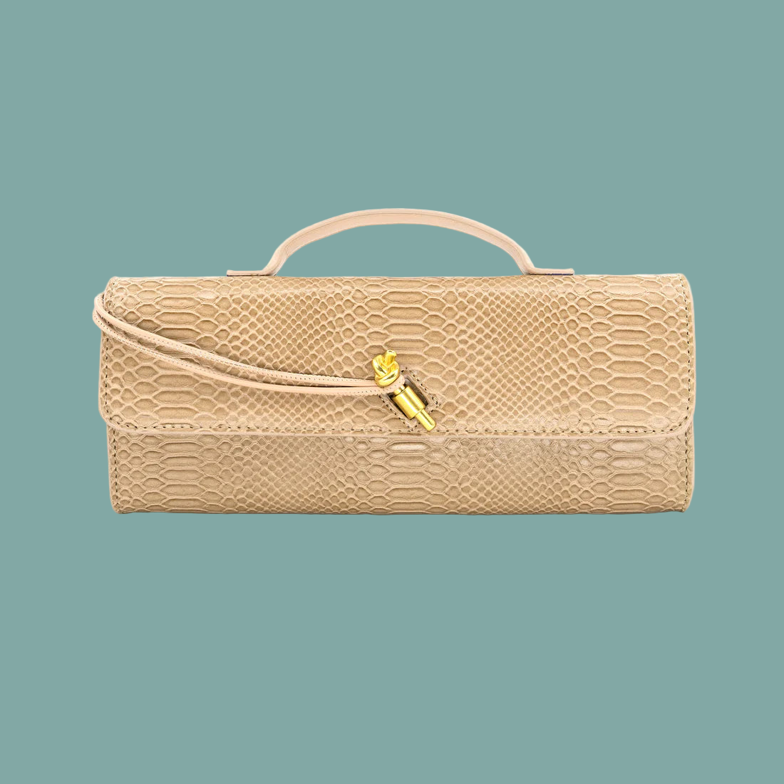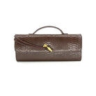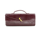 Faux leather croc embossed clutch with top handle and chic gold closure. Adjustable crossbody strap included.