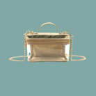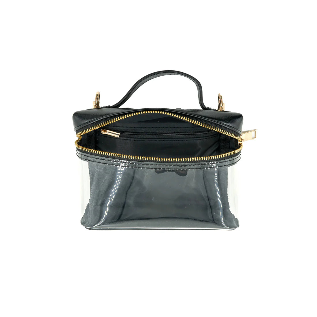 Clear crossbody bag. Perfect for stadium events! Front is clear and back is color. Features a cute little top handle and removable gold chain crossbody strap.