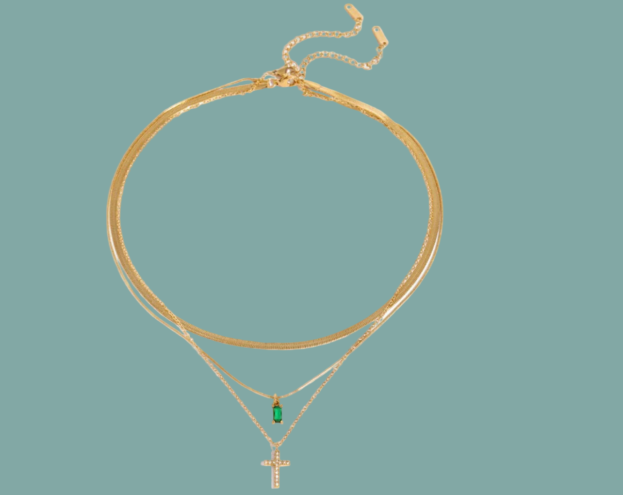 The Reese Multi Layer Necklace features three distinct layers for a stylish, stacked look. The top layer is a 14.9-inch snake chain, followed by a 16.12-inch emerald stone chain, and finished with a 17.8-inch diamond cross chain. This necklace is 100% waterproof, making it perfect for everyday wear without worry. Its casual design adds a subtle, elegant touch to any outfit.